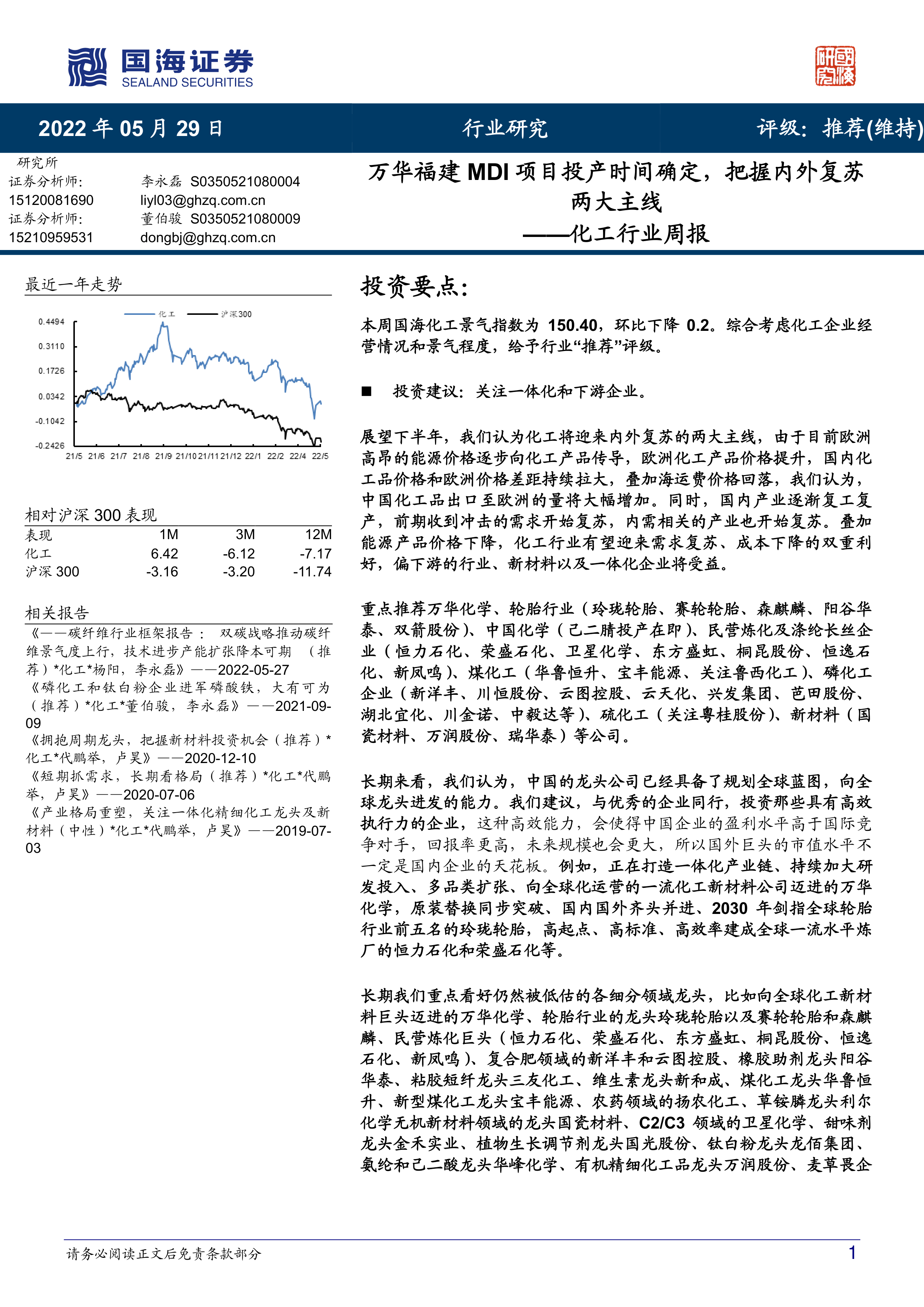 重点推荐万华化学、轮胎行业(玲珑轮胎、赛轮轮胎、森麒麟、阳谷华泰、双箭股份)、中国化学(己二腈投产在即)、民营炼化及涤纶长丝企业(恒力石化、荣盛石化、卫星化学、东方盛虹、桐昆股份、恒逸石化、新凤鸣)、煤化工(华鲁恒升、宝丰能源、关注鲁西化工)、磷化工企业(新洋丰、川恒股份、云图控股、云天化、兴发集团、芭田股份、湖北宜化、川金诺、中毅达等)、硫化工(关注粤桂股份)、新材料(国瓷材料、万润股份、瑞华泰)等公司。
