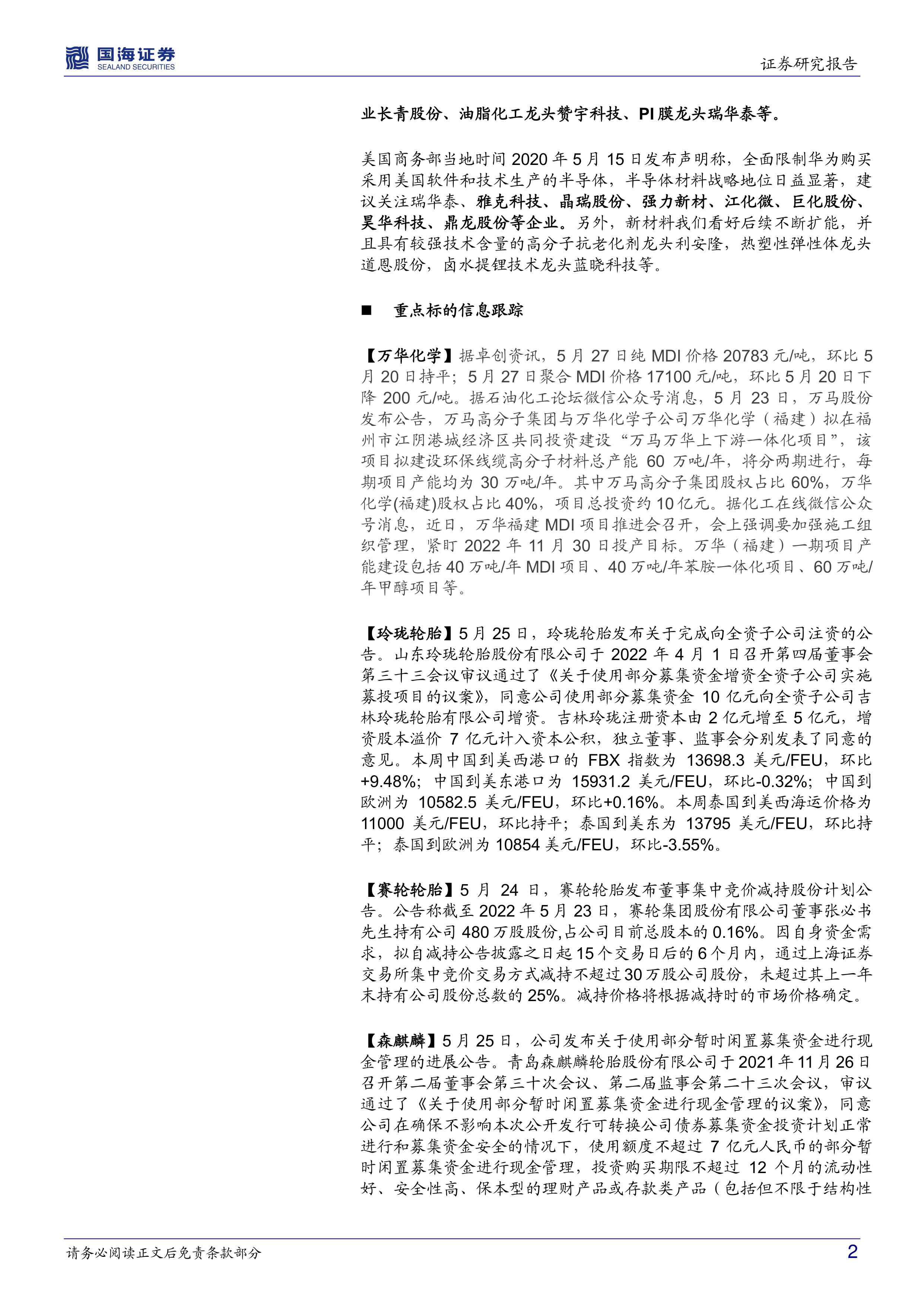 【玲珑轮胎】5月25日,玲珑轮胎发布关于完成向全资子公司注资的公告。山东玲珑轮胎股份有限公司于2022年4月1日召开第四届董事会第三十三会议审议通过了《关于使用部分募集资金增资全资子公司实施募投项目的议案》,同意公司使用部分募集资金10亿元向全资子公司吉林玲珑轮胎有限公司增资。吉林玲珑注册资本由2亿元增至5亿元,增资股本溢价7亿元计入资本公积,独立董事、监事会分别发表了同意的意见。本周中国到美西港口的FBX指数为13698.3美元/FEU,环比+9.48%;中国到美东港口为15931.2美元/FEU,环比-0.32%;中国到欧洲为10582.5美元/FEU,环比+0.16%。本周泰国到美西海运价格为11000美元/FEU,环比持平;泰国到美东为13795美元/FEU,环比持平;泰国到欧洲为10854美元/FEU,环比-3.55%。