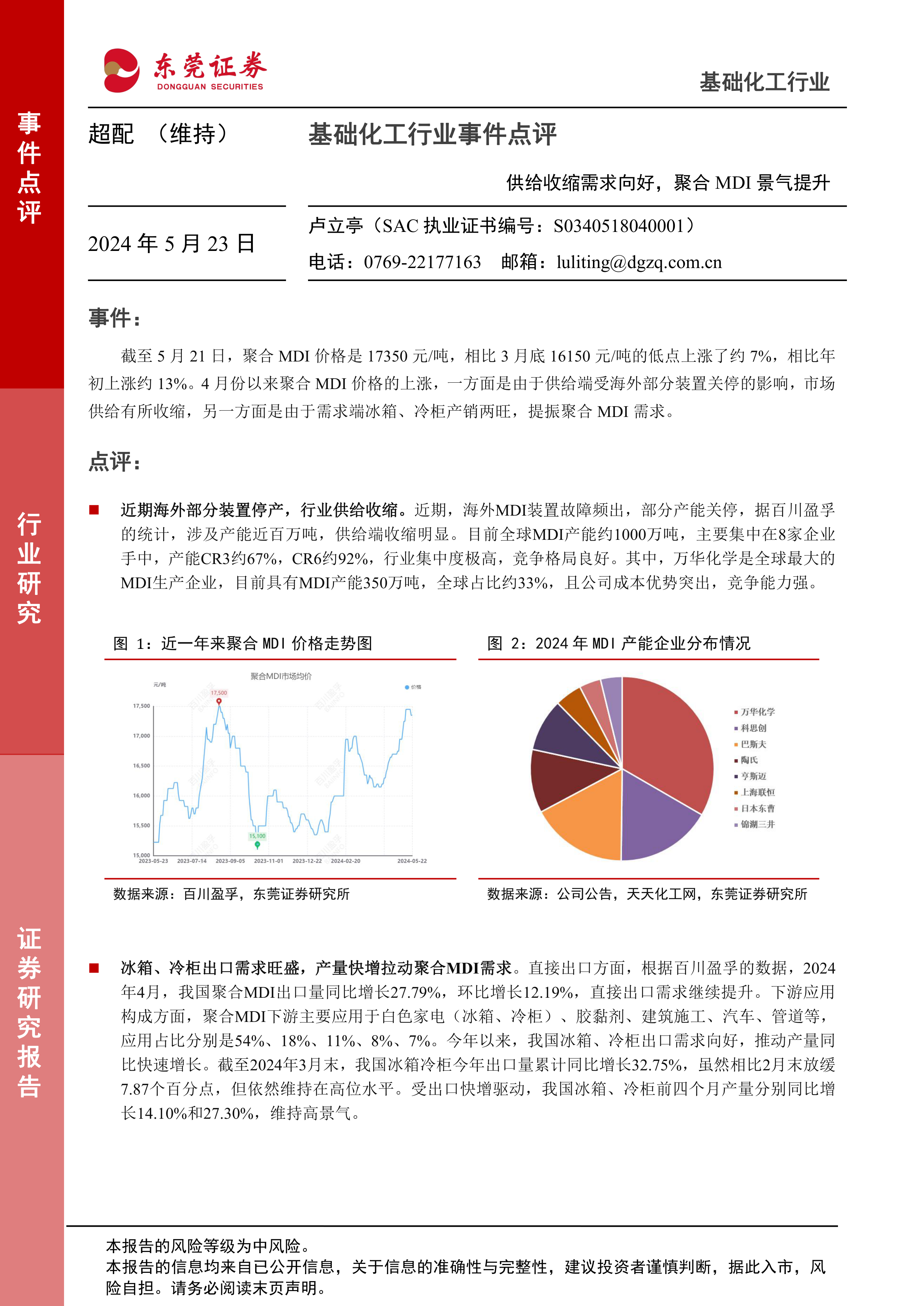 基础化工行业事件点评:供给收缩需求向好,聚合MDI景气提升