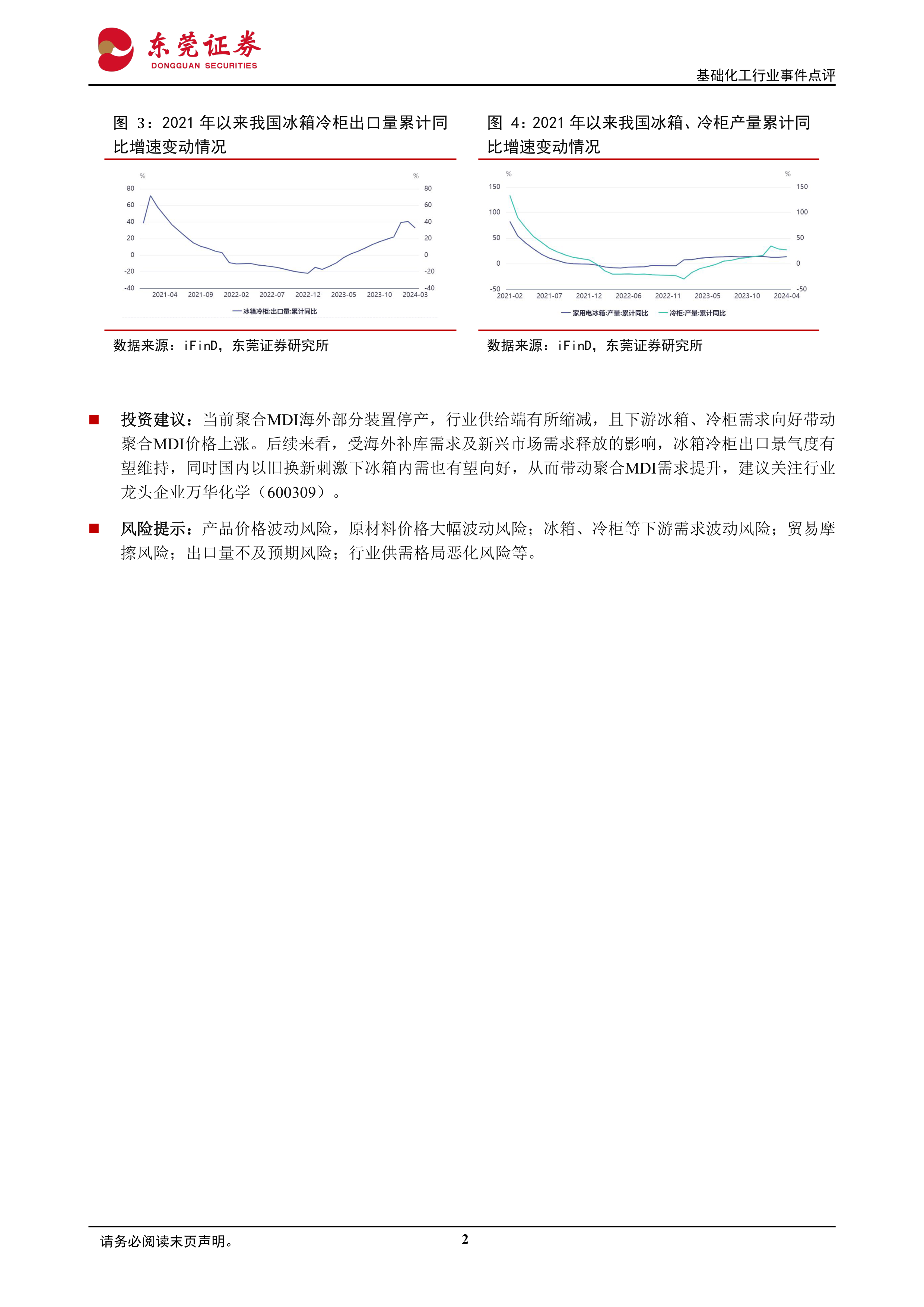 本报告的核心观点是:聚合MDI价格上涨主要受到供给收缩和需求向好的双重驱动。海外装置停产导致供给减少,而下游冰箱、冷柜等白色家电的需求旺盛,进一步推高了聚合MDI的价格。