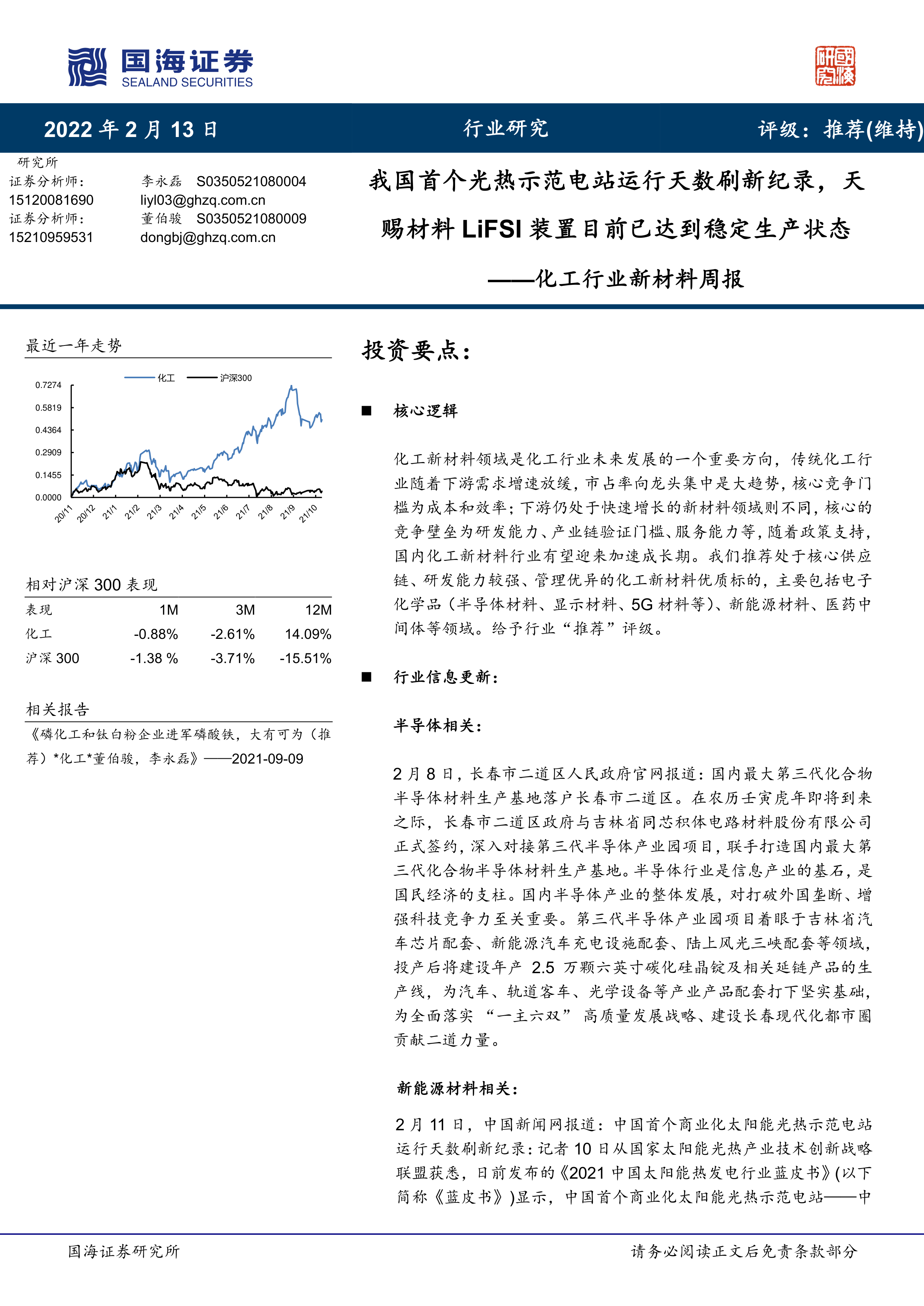 化工行业新材料周报:我国首个光热示范电站运行天数刷新纪录,天赐材料LiFSI装置目前已达到稳定生产状态