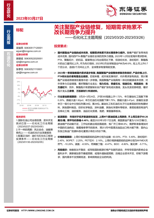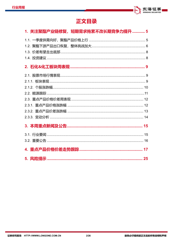 本报告分析了聚酯产业链的修复情况,认为国内聚酯产业链具有长期竞争力,并推荐了相关龙头企业。报告还跟踪了石化&化工板块的周表现,包括股票市场行情、能源价格和重点产品价差,以及本周的行业新闻和公司公告。最后,通过图表形式跟踪了多种重点产品的价格价差走势,为投资者提供参考。