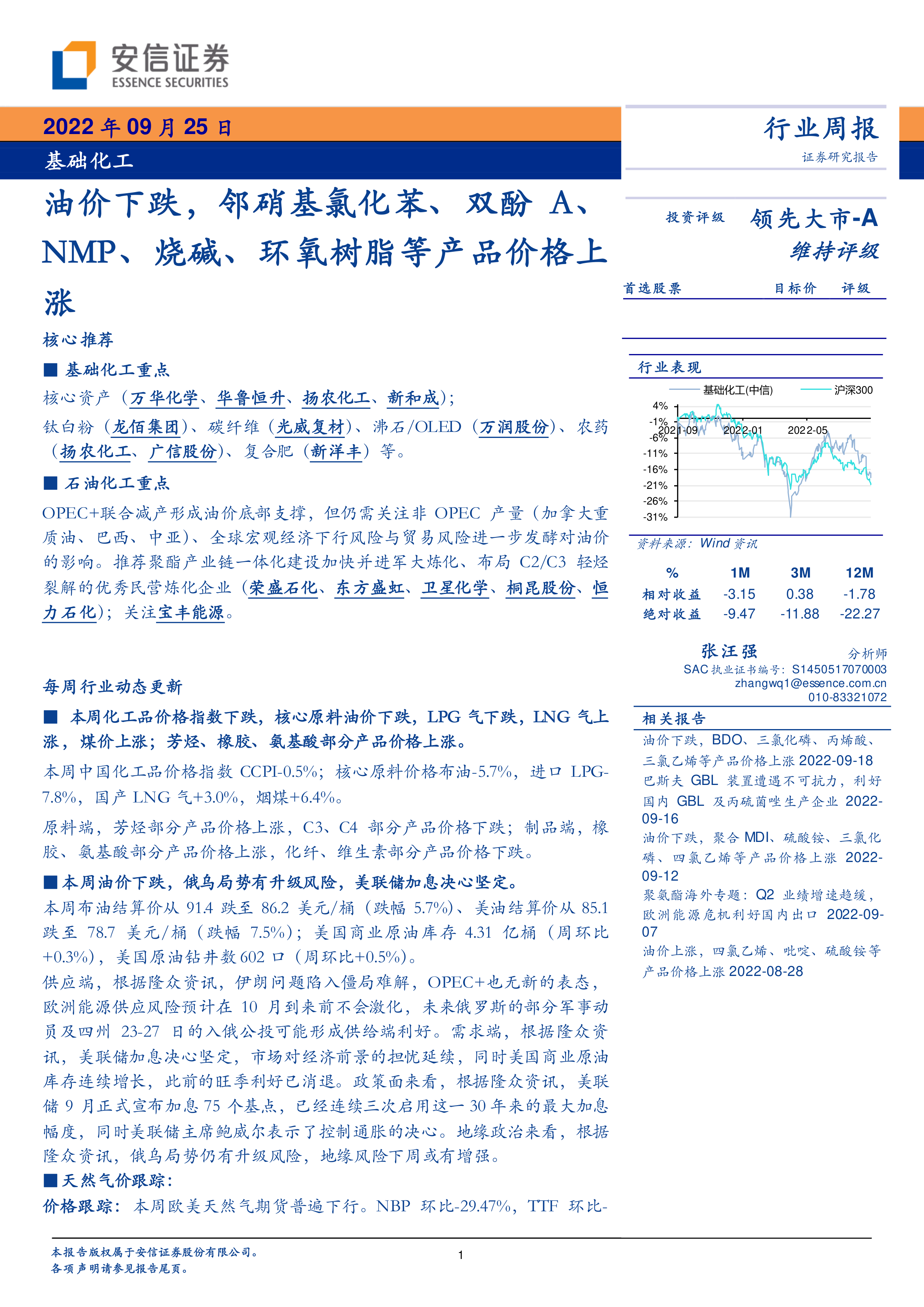 基础化工行业周报:油价下跌,邻硝基氯化苯、双酚A、NMP、烧碱、环氧树脂等产品价格上涨