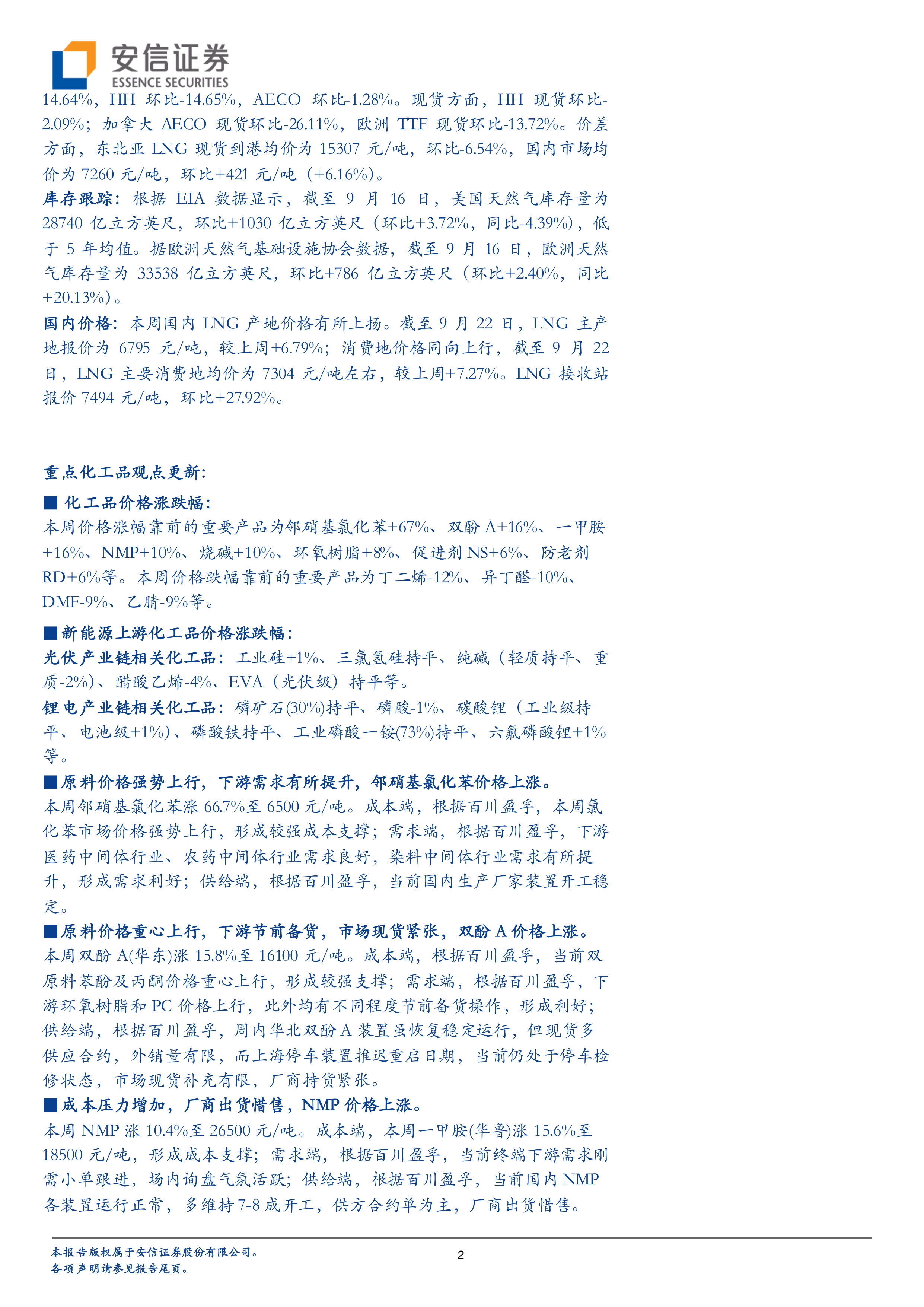国内价格: 本周国内 LNG 产地价格有所上扬。截至 9 月 22 日, LNG 主产地报价为 6795 元/吨,较上周+6.79%;消费地价格同向上行,截至 9 月 22日, LNG 主要消费地均价为 7304 元/吨左右,较上周+7.27%。 LNG 接收站报价 7494 元/吨,环比+27.92%。