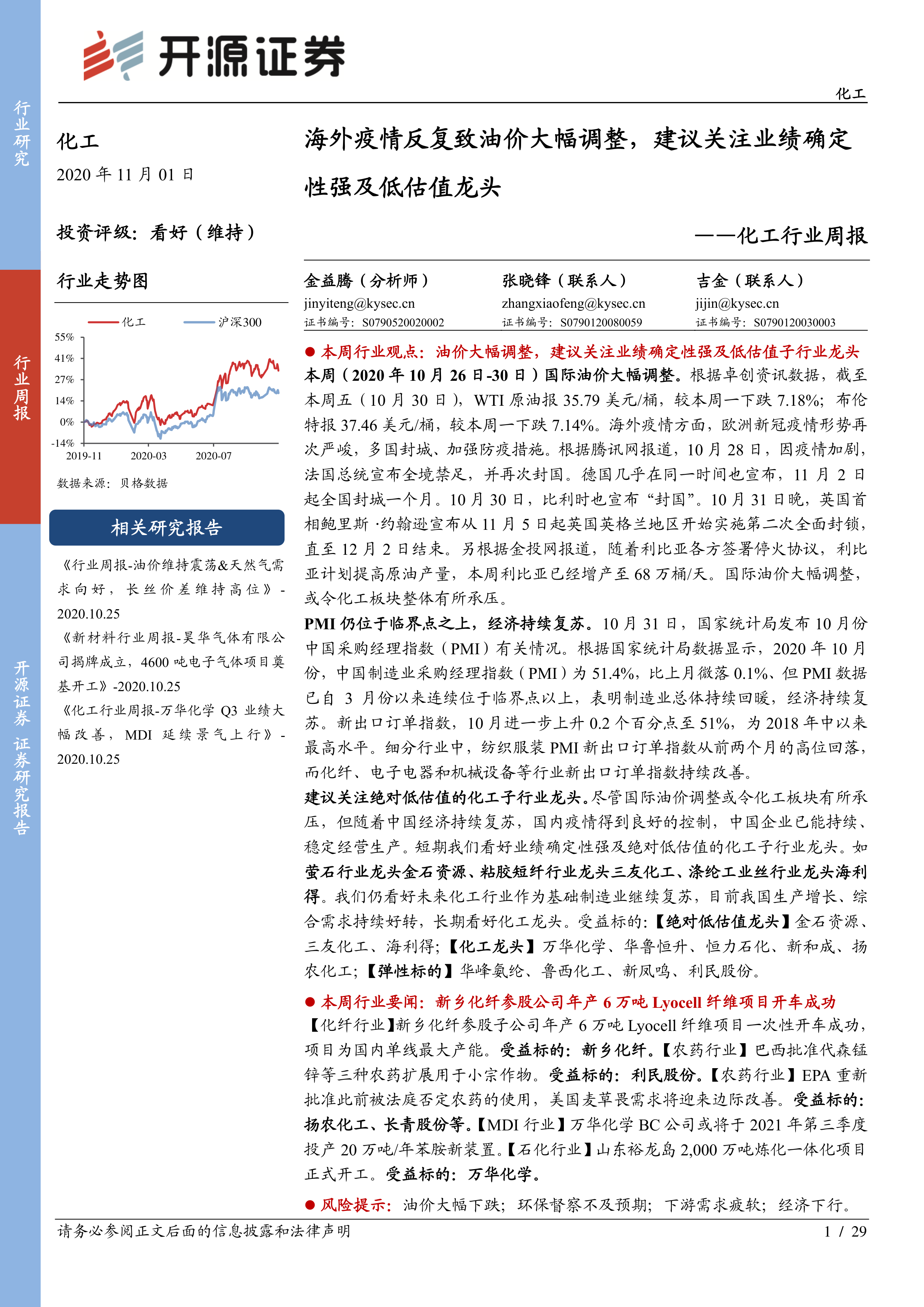 建议关注绝对低估值的化工子行业龙头。尽管国际油价调整或令化工板块有所承压,但随着中国经济持续复苏,国内疫情得到良好的控制,中国企业已能持续、稳定经营生产。短期我们看好业绩确定性强及绝对低估值的化工子行业龙头。如萤石行业龙头金石资源、粘胶短纤行业龙头三友化工、涤纶工业丝行业龙头海利得。我们仍看好未来化工行业作为基础制造业继续复苏,目前我国生产增长、综合需求持续好转,长期看好化工龙头。受益标的:【绝对低估值龙头】金石资源、三友化工、海利得;【化工龙头】万华化学、华鲁恒升、恒力石化、新和成、扬农化工;【弹性标的】华峰氨纶、鲁西化工、新凤鸣、利民股份。