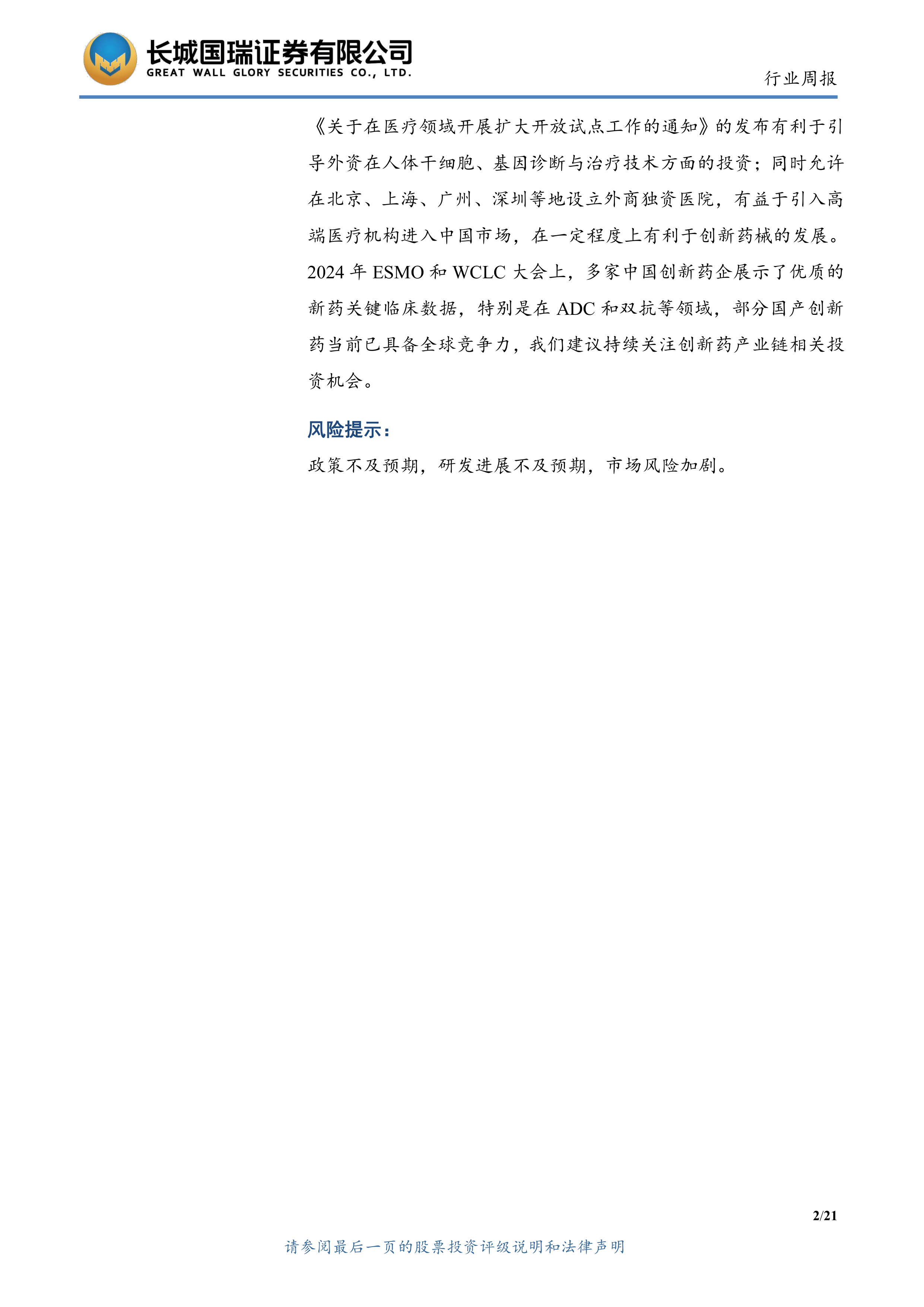 《关于在医疗领域开展扩大开放试点工作的通知》的发布有利于引导外资在人体干细胞、基因诊断与治疗技术方面的投资;同时允许在北京、上海、广州、深圳等地设立外商独资医院,有益于引入高端医疗机构进入中国市场,在一定程度上有利于创新药械的发展。2024年ESMO和WCLC大会上,多家中国创新药企展示了优质的新药关键临床数据,特别是在ADC和双抗等领域,部分国产创新药当前已具备全球竞争力,我们建议持续关注创新药产业链相关投资机会。