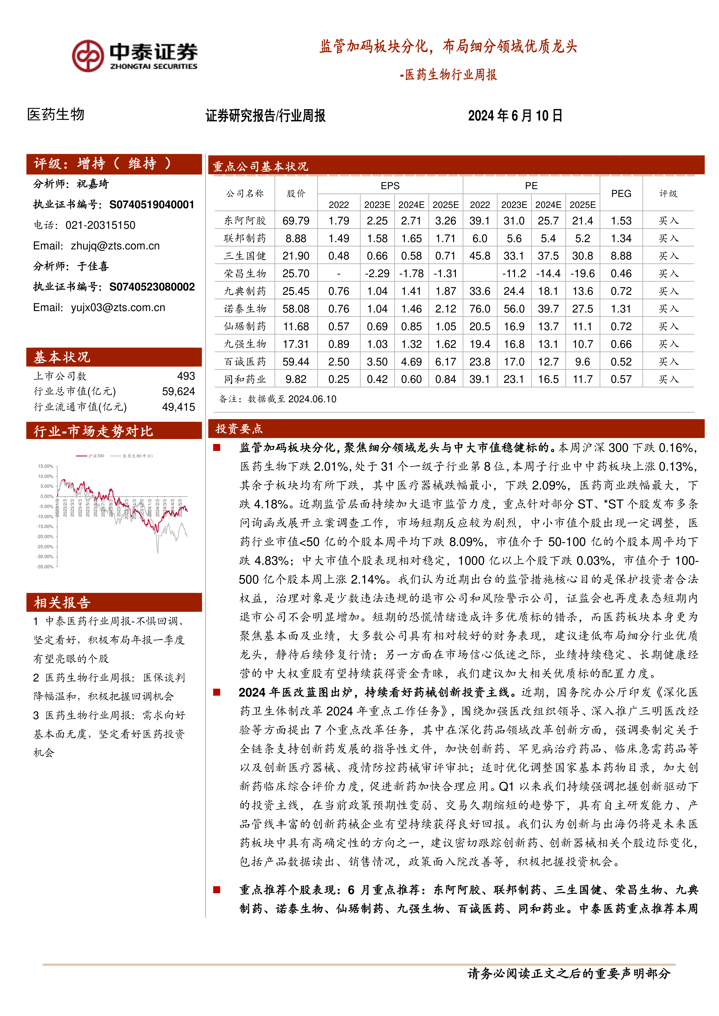 重点推荐个股表现:6月重点推荐:东阿阿胶、联邦制药、三生国健、荣昌生物、九典制药、诺泰生物、仙琚制药、九强生物、百诚医药、同和药业。中泰医药重点推荐本周平均下跌0.32%,跑赢医药行业1.68%。