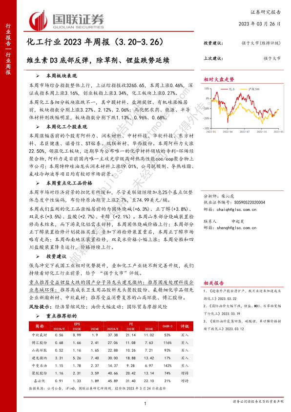 重点推荐受益锂盐大跌的国产分子筛龙头建龙微纳;推荐固废处理科技企业惠城环保;推荐高成长卫生用品胶料龙头聚胶股份、氟精细化学品领先企业新瀚新材、中欣氟材;推荐受益消费复苏的山高环能、博汇股份。