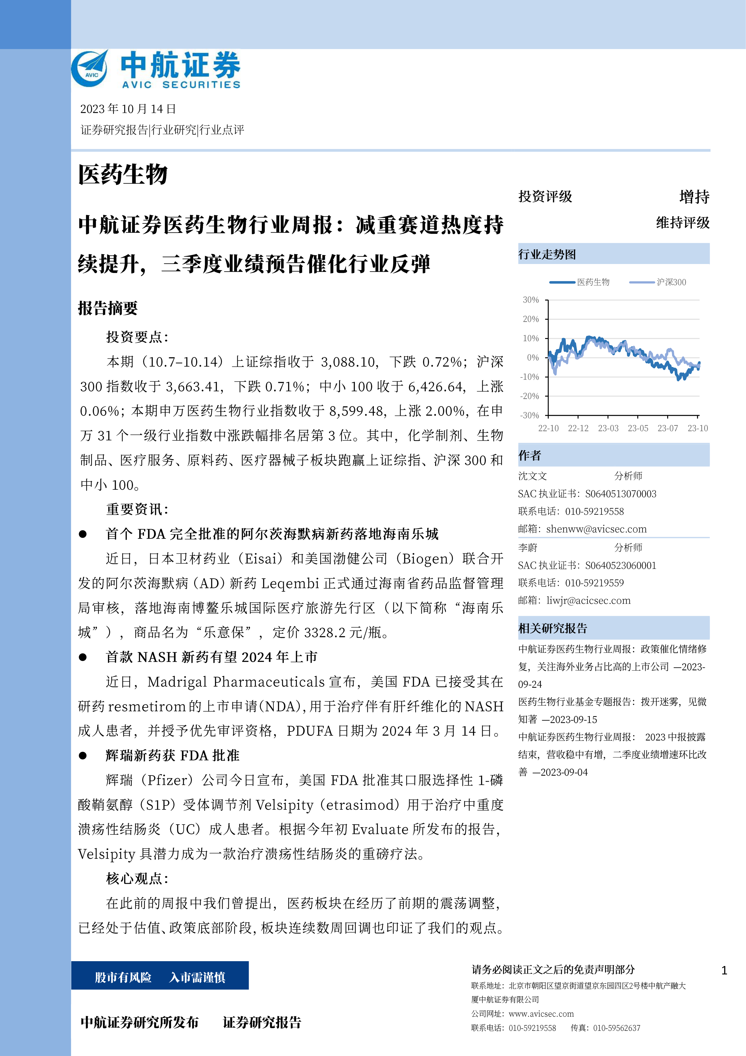 医药生物行业周报:减重赛道热度持续提升,三季度业绩预告催化行业反弹