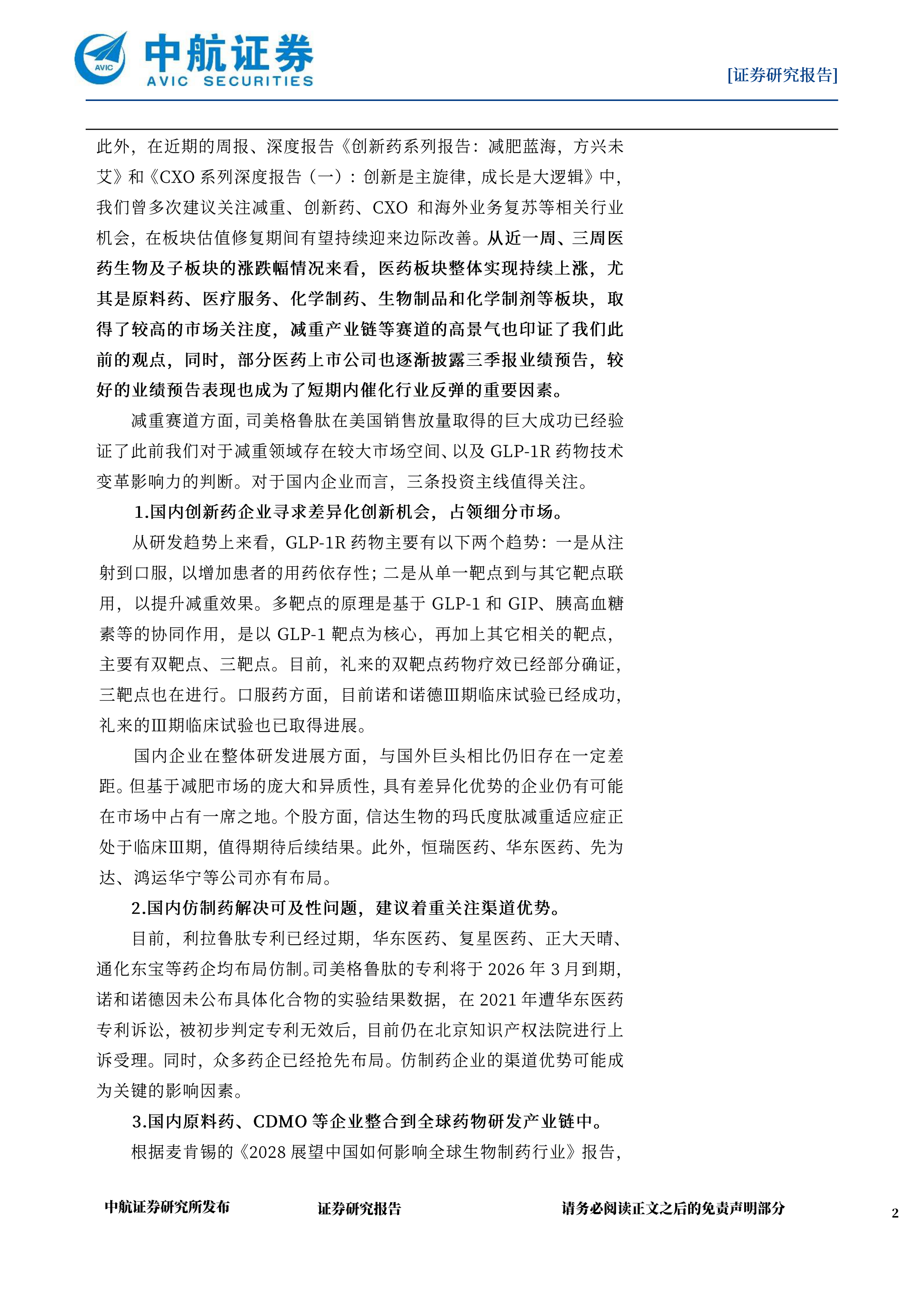 在此前的周报中我们曾提出,医药板块在经历了前期的震荡调整已经处于估值、政策底部阶段,板块连续数周回调也印证了我们的观点此外,在近期的周报、深度报告《创新药系列报告:减肥蓝海,方兴未艾》和《CXO系列深度报告(一):创新是主旋律,成长是大逻辑》中,我们曾多次建议关注减重、创新药、CXO和海外业务复苏等相关行业机会,在板块估值修复期间有望持续迎来边际改善。从近一周、三周医药生物及子板块的涨跌幅情况来看,医药板块整体实现持续上涨,无其是原料药、医疗服务、化学制药、生物制品和化学制剂等板块,取得了较高的市场关注度,减重产业链等赛道的高景气也印证了我们此前的观点,同时,部分医药上市公司也逐渐披露三季报业绩预告,较好的业绩预告表现也成为了短期内催化行业反弹的重要因素。减重赛道方面,司美格鲁肽在美国销售放量取得的巨大成功已经验证了此前我们对于减重领域存在较大市场空间、以及GLP-1R药物技术变革影响力的判断。对于国内企业而言,三条投资主线值得关注。