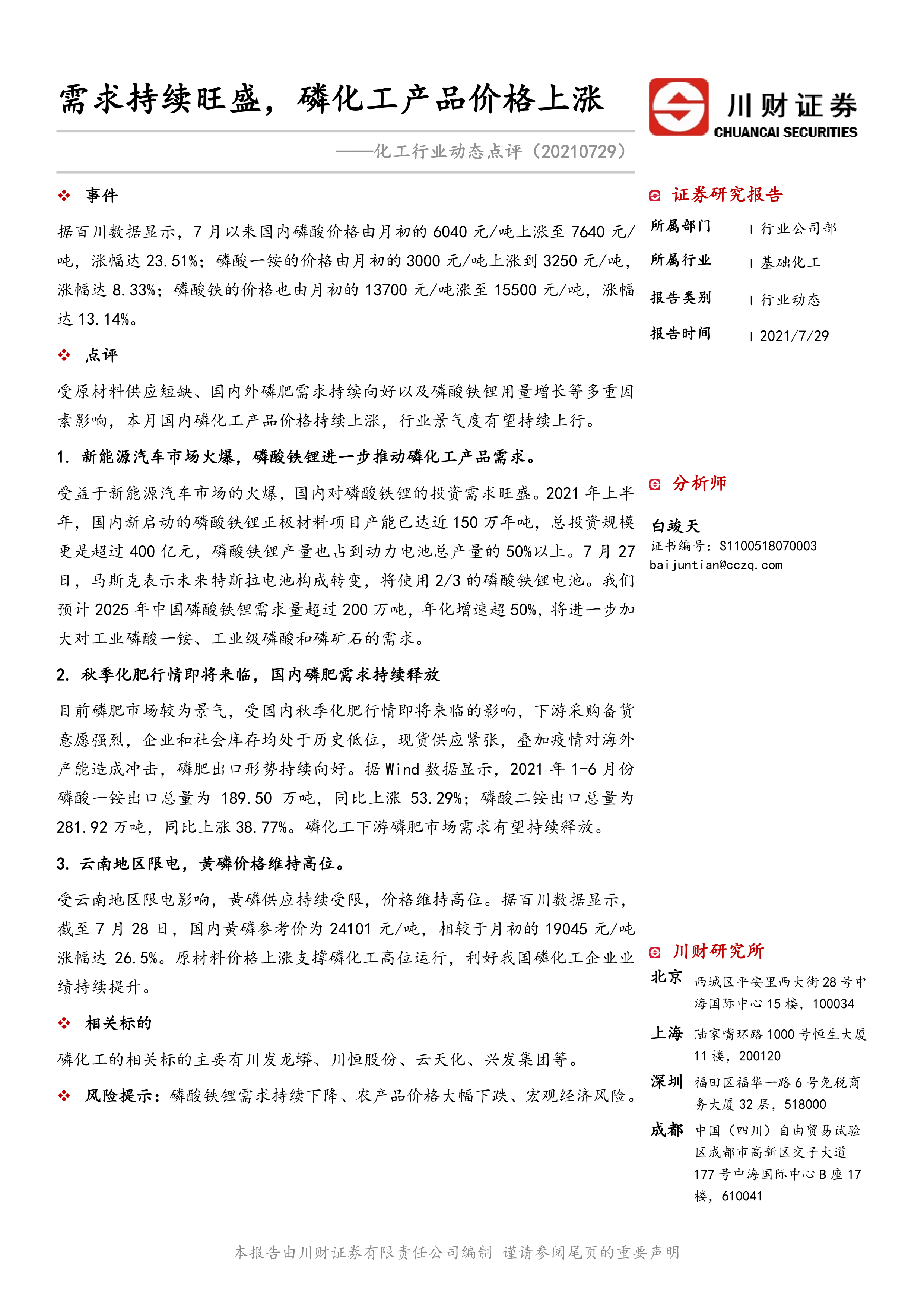 综上所述,在新能源汽车市场火爆、秋季化肥行情来临以及云南地区限电等多重因素的共同作用下,磷化工产品价格持续上涨,行业景气度有望持续上行。