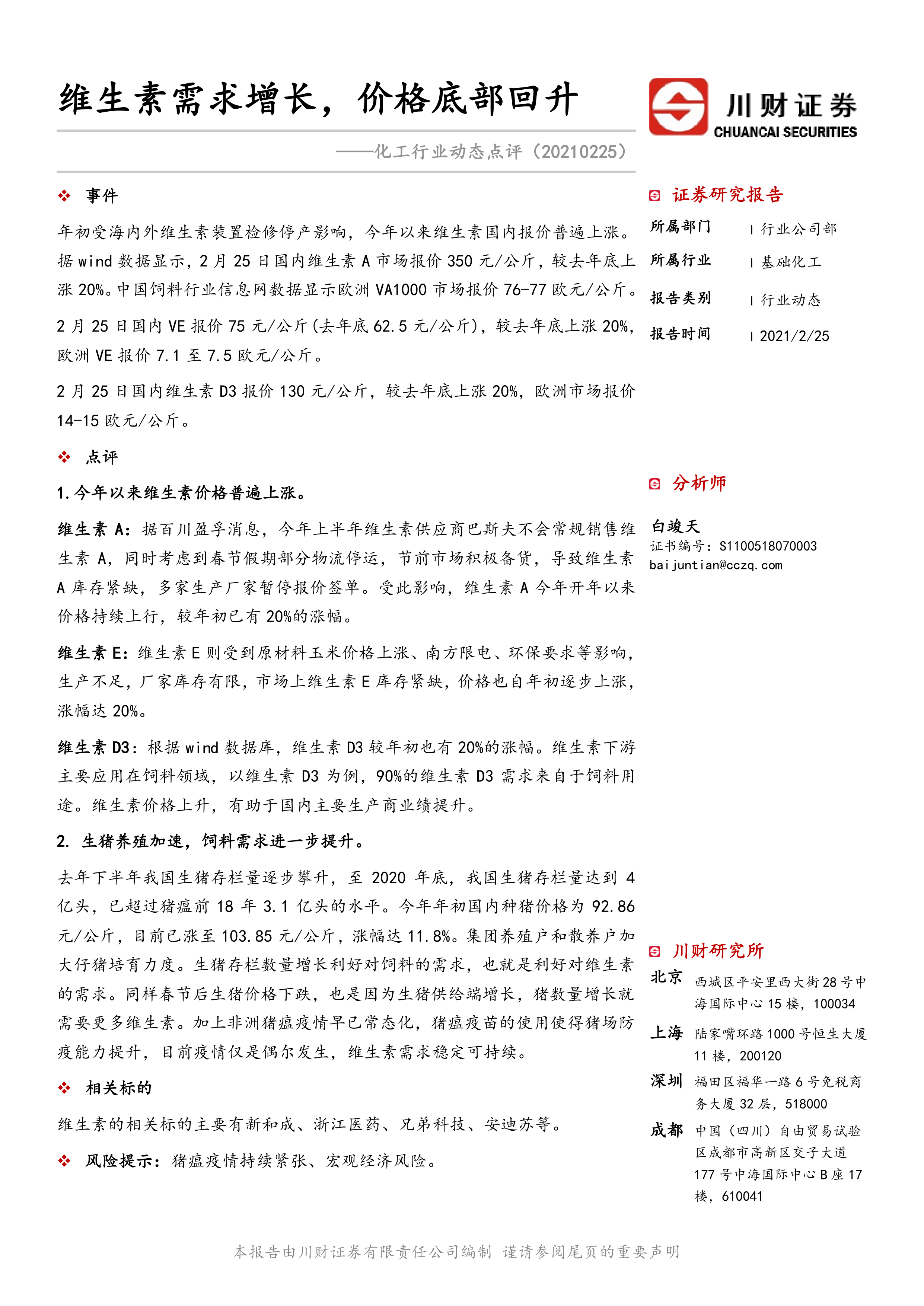 本报告分析了2021年初维生素市场价格上涨的现象,指出供应端的装置检修和需求端的生猪养殖加速是主要驱动因素。生猪存栏量增加和疫情常态化背景下,饲料需求稳定增长,为维生素行业带来持续利好。建议关注新和成、浙江医药等相关标的。同时,报告提示投资者注意猪瘟疫情和宏观经济风险。