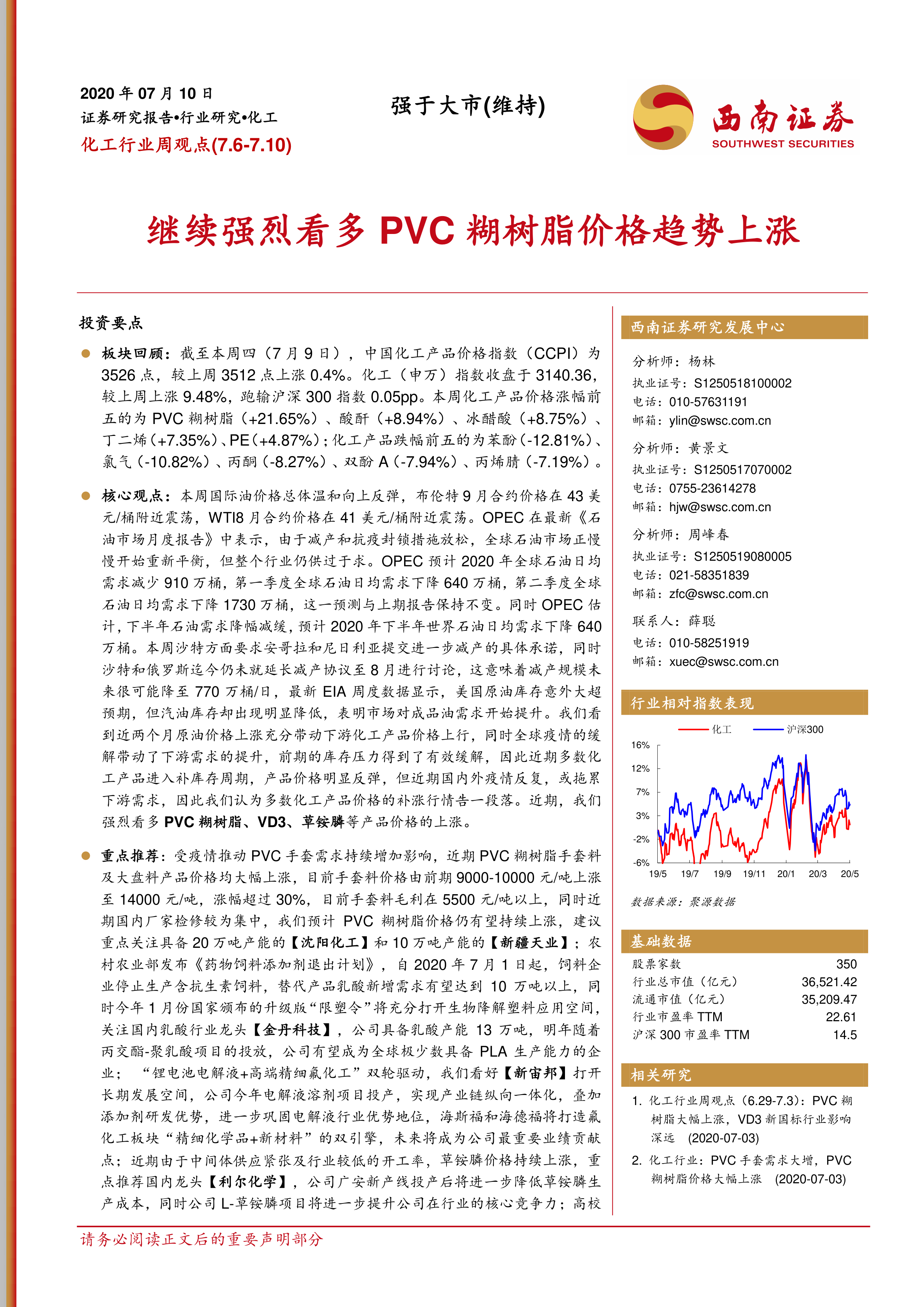本周(7月6日至7月10日),中国化工产品价格指数(CCPI)上涨0.4%至3526点,化工(申万)指数上涨9.48%,跑输沪深300指数0.05个百分点。价格涨幅前五的产品包括PVC糊树脂(+21.65%)、酸酐(+8.94%)、冰醋酸(+8.75%)、丁二烯(+7.35%)和PE(+4.87%)。跌幅前五的为苯酚(-12.81%)、氯气(-10.82%)、丙酮(-8.27%)、双酚A(-7.94%)和丙烯腈(-7.19%)。国际油价温和反弹,布伦特和WTI原油价格分别在43美元/桶和41美元/桶附近震荡。OPEC预计2020年全球石油日均需求减少910万桶,下半年降幅减缓至640万桶。尽管OPEC认为市场正缓慢再平衡,但整体仍供过于求。EIA数据显示美国原油库存超预期,但汽油库存下降表明成品油需求提升。原油价格上涨和全球疫情缓解带动下游化工产品价格上行,库存压力缓解,多数产品进入补库存周期。然而,疫情反复可能拖累下游需求,多数化工产品价格的补涨行情或将告一段落。报告强烈看多PVC糊树脂、VD3和草铵膦等产品价格。