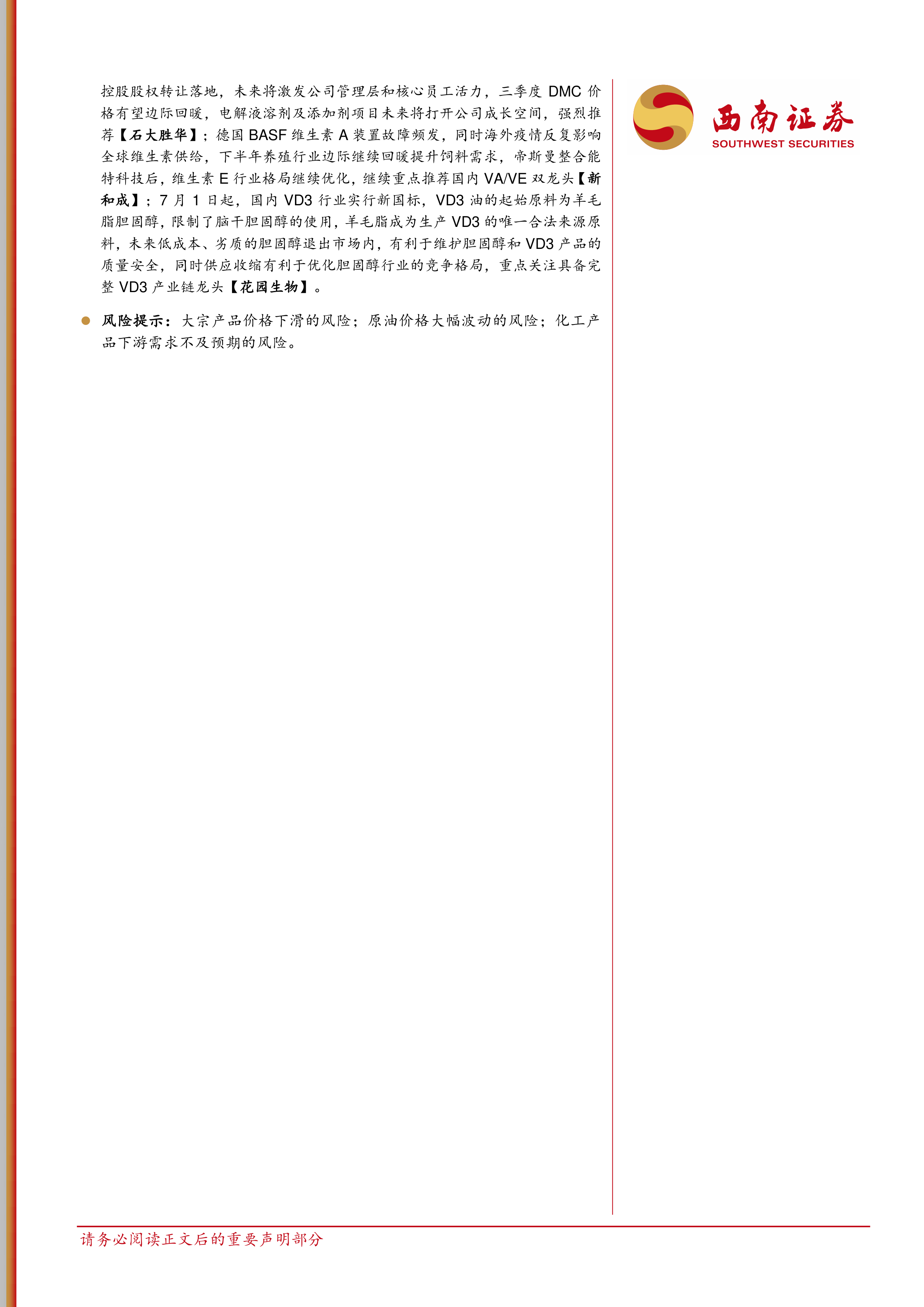 维生素D3价格170-190元/kg,7月1日起实施新国标,规定VD3油起始原料为羊毛脂胆固醇,限制脑干胆固醇,有利于优化胆固醇行业竞争格局。重点关注具备产业链一体化优势的饲料级VD3龙头【花园生物】(现有产能3000吨)。维生素A价格405-420元/kg,巴斯夫因质量问题停止三季度接单,DSM报价提高,国内有企业停止报价,预计7-8月份厂家检修将导致供应持续收紧。维生素E价格65-70元/kg,受原料丙酮涨价支撑。泛酸钙、维生素B1、生物素、维生素C、叶酸、维生素K3和烟酰胺价格均有不同程度波动。建议关注供需格局好的维生素品种,如VA、VE、VD3,以及【新和成】、【浙江医药】、【花园生物】等相关标的。