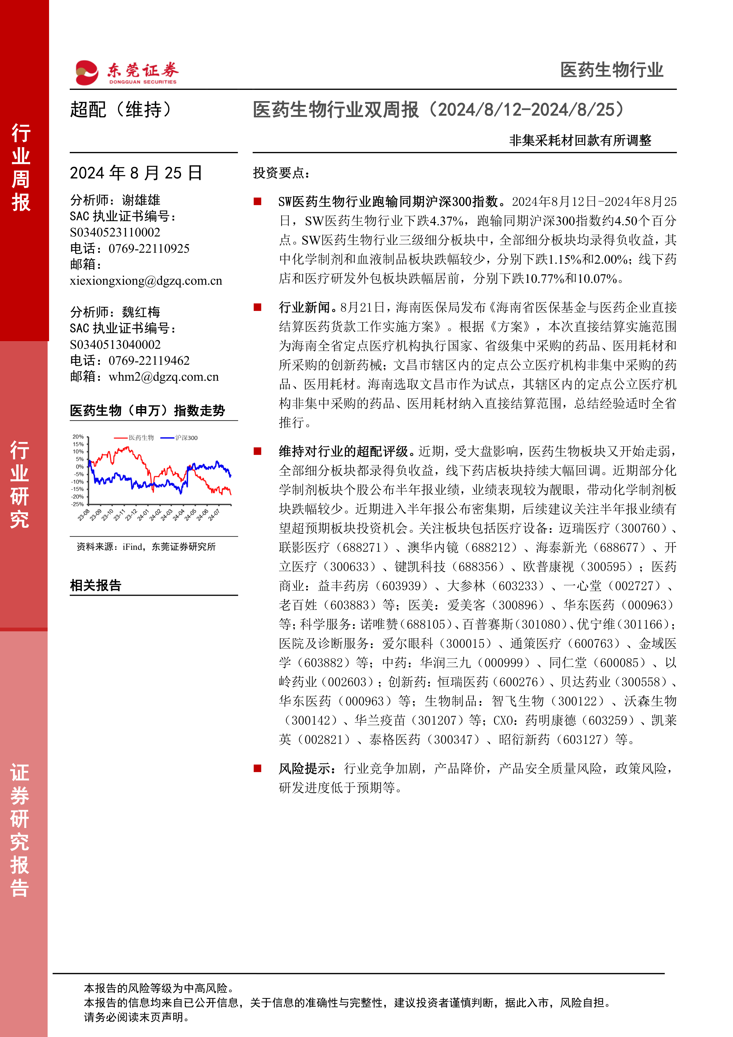本报告对2024年8月12日至8月25日期间的医药生物行业进行了全面分析。报告期内,SW医药生物行业整体表现不佳,跑输沪深300指数,所有细分板块均录得负收益,其中线下药店和医疗研发外包跌幅居前。然而,行业估值已处于历史低位,且海南医保局试点非集采耗材直接结算的政策,有望改善行业回款效率。在半年报密集披露期,建议投资者重点关注业绩有望超预期的医疗设备、医药商业、医美、科学服务、医院及诊断服务、中药、创新药、生物制品和CXO等细分领域,以把握结构性投资机会。同时,需警惕行业政策、研发进展、产品质量、原料价格波动及市场竞争加剧等多重风险。
