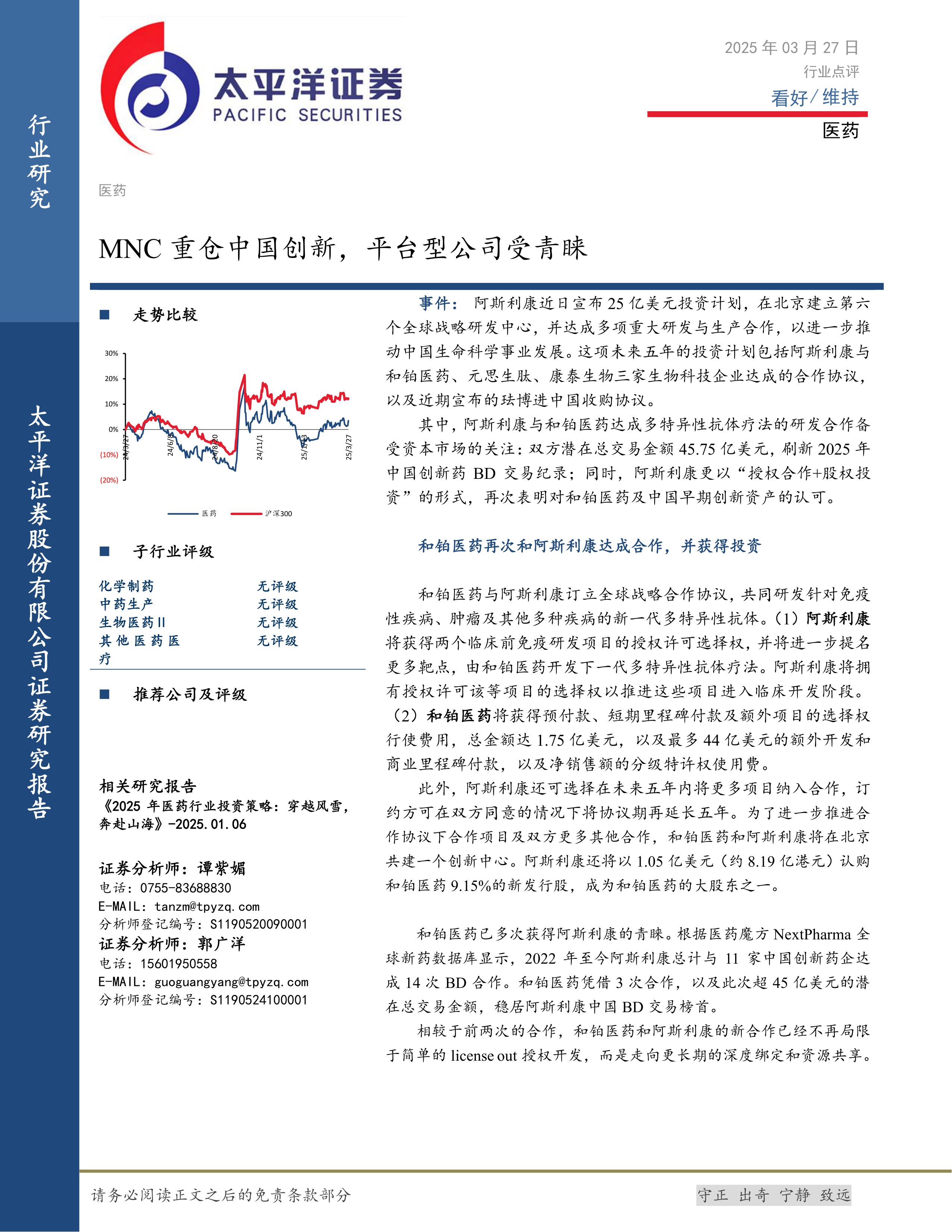 本报告分析了阿斯利康对中国创新药企和铂医药的投资合作,以及MNC与平台型CRO合作增多的趋势,揭示了以下核心观点: