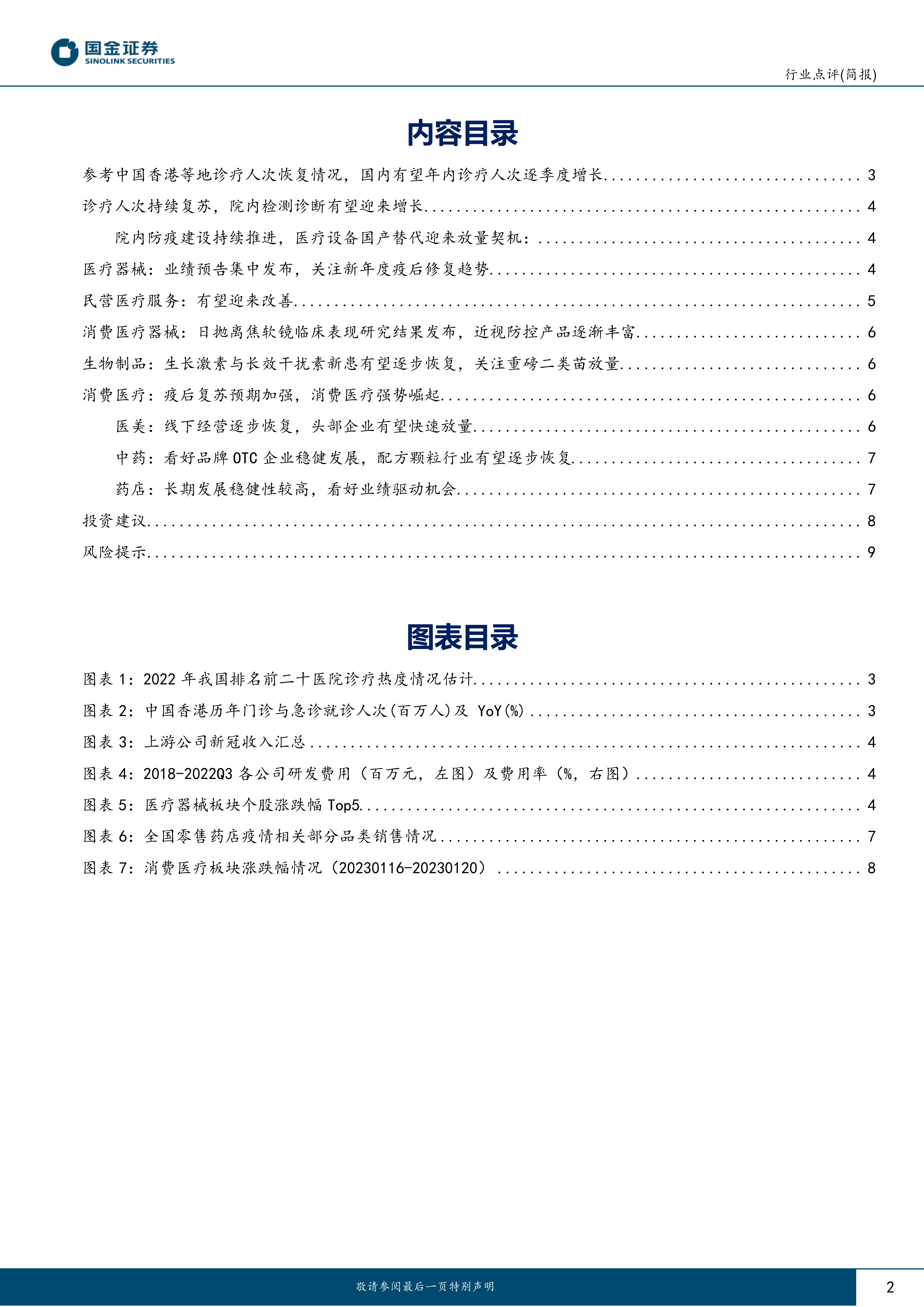 本报告的核心观点是,随着国内疫情高峰过去,医药医疗板块正迅速恢复到常规增长轨道。预计春节后,医疗板块的经营状况将进一步改善,诊疗人次有望逐季度增长。