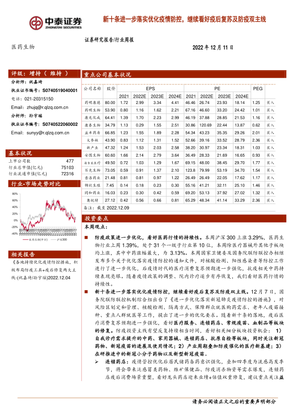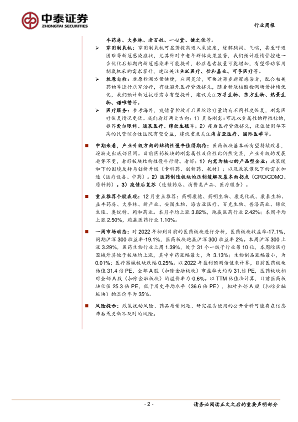新十条进一步落实优化疫情防控,继续看好疫后复苏及防疫双主线。 12 月 7 日,国务院联防联控机制综合组出台了《进一步优化落实新冠肺炎疫情防控的措施》,对风险区划定和管理、核酸检测、隔离方式、保障群众就医购药需求、老年人疫苗接种、重点人群就医等工作,提出了进一步的优化要求。 随着新十条的落地, 疫后医疗消费复苏预期进一步强化,看好医疗服务、连锁药店、常规疫苗、血制品等板块的修复。 防疫投资主线有望反复持续相当时间,看好相关细分板块投资机会: 1)自我诊疗需求提升的中药、家用器械、连锁药店、抗原自检等板块,同时关注新冠药物、新冠疫苗的进展及使用情况; 2)产业周期叠加防疫催化的医疗新基建; 3)在研推进中的新冠小分子药物以及新型新冠疫苗。