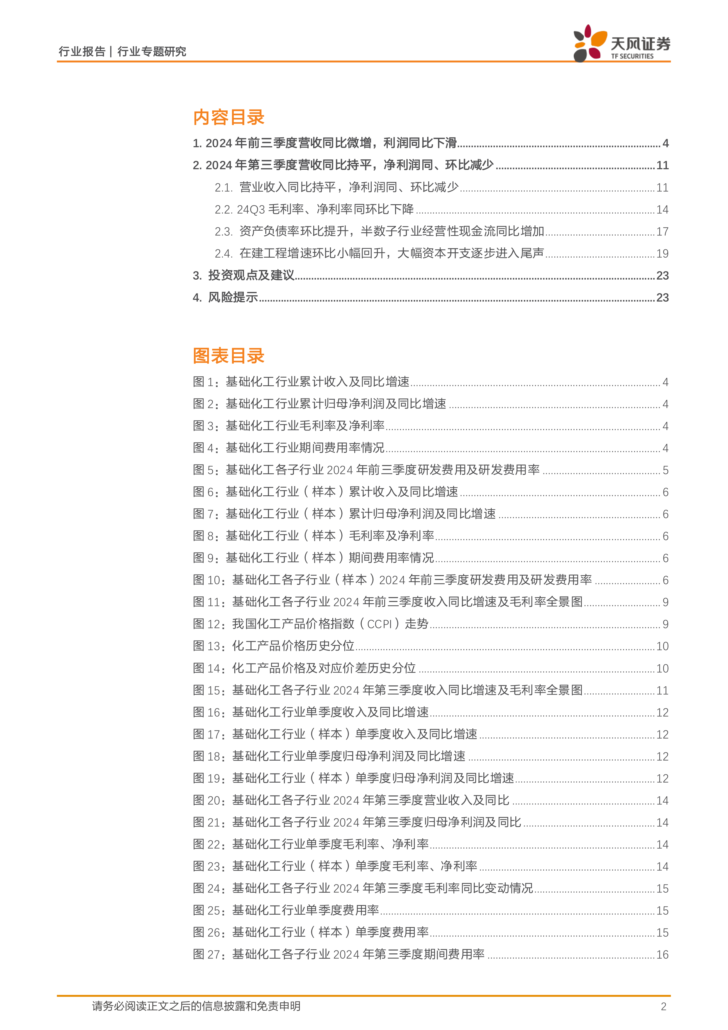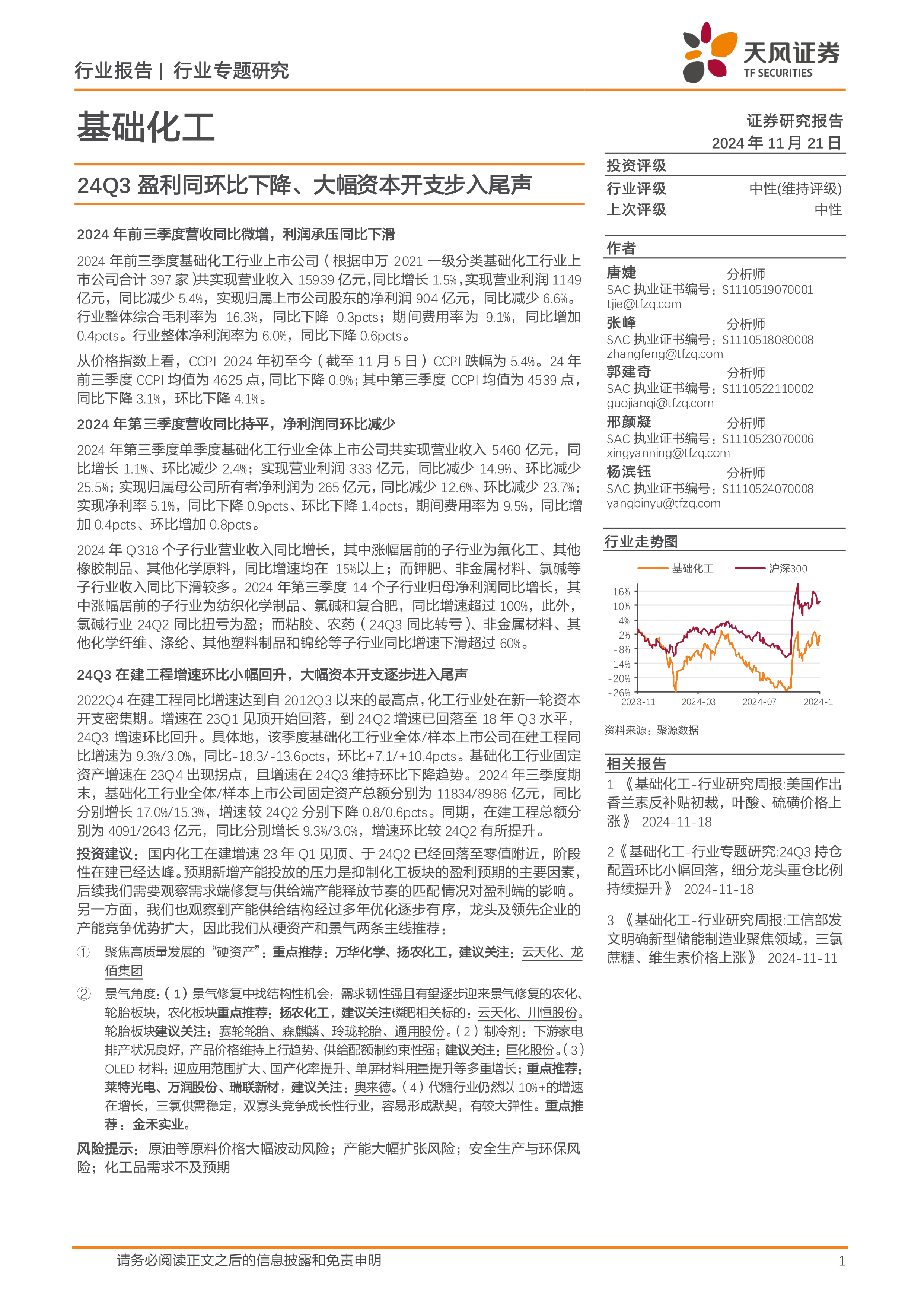 基础化工行业专题研究:24Q3盈利同环比下降、大幅资本开支步入尾声