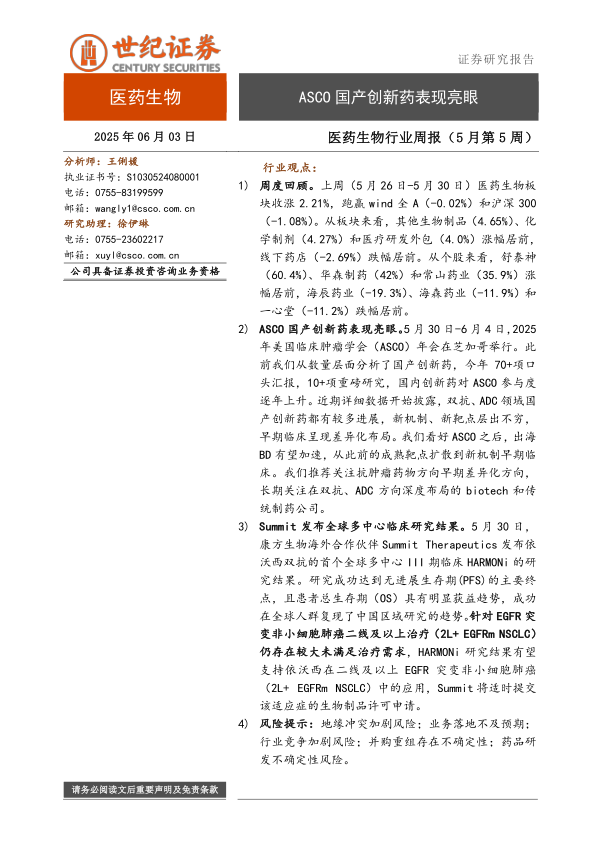 医药生物行业周报(5月第5周):ASCO国产创新药表现亮眼