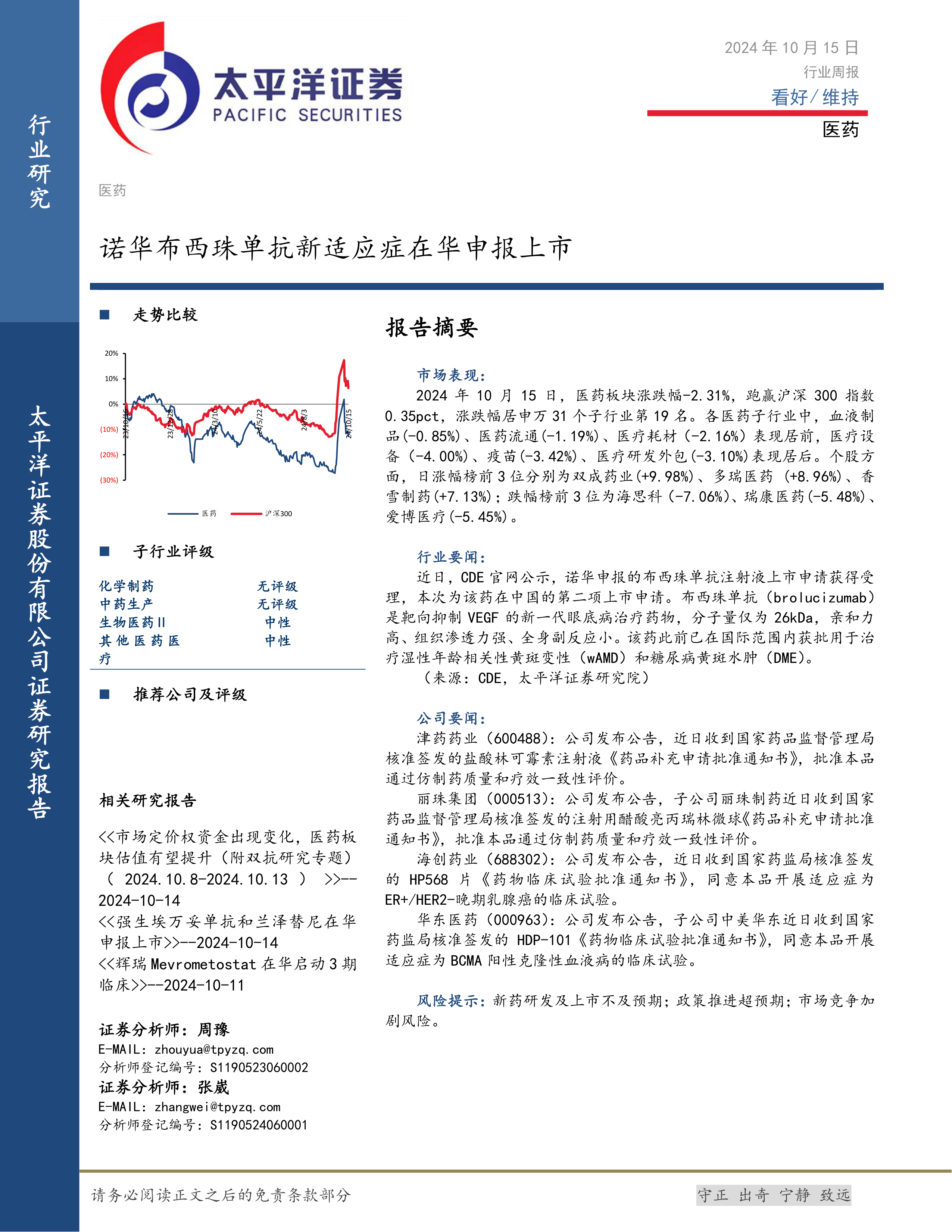 报告关注医药行业内的新动态,如诺华布西珠单抗新适应症在华申报上市,以及津药药业、丽珠集团产品通过仿制药一致性评价等事件,反映了医药行业创新和质量提升的趋势。