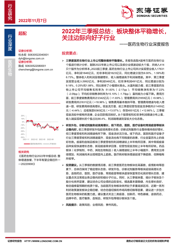 医药生物行业深度报告:2022年三季报总结:板块整体平稳增长,关注边际向好子行业