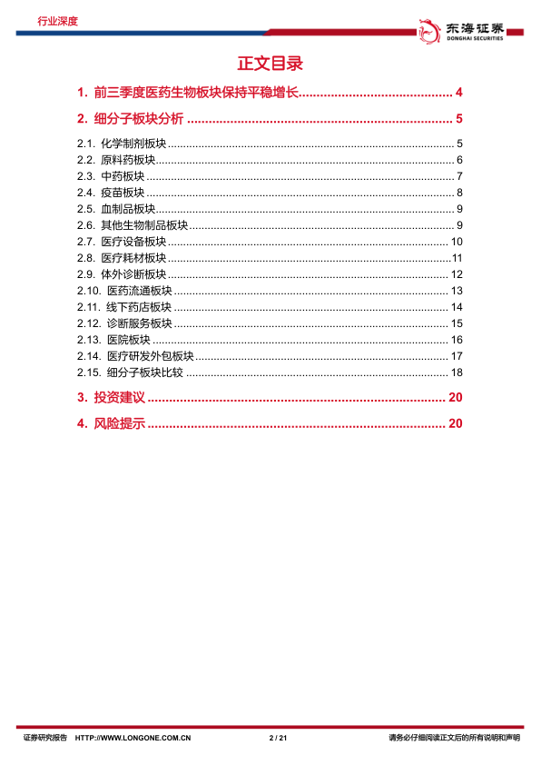 投资建议。从三季报的数据情况看,前三季度医药生物板块在高基数、疫情影响等因素下,总体仍保持了稳定增长态势;研发外包、诊断试剂服务等板块延续高增长态势,连锁药店、医院、医疗设备、常规疫苗等板块逐渐恢复常态化良好增长态势,建议重点关注常规业务企稳向好的细分子行业。同时,从三季报来看,细分子板块及个股分化依然显著,建议结合公司业绩的边际变化,精选基本面稳健、内生增长良好、有估值修复预期的优质个股。当前医药生物板块依然处于多重底部区间,近期一系列利好政策激发板块企稳回暖,结合估值切换和市场风格切换等因素,建议进一步加大医药生物板块的配置力度。建议重点关注二类疫苗、创新药、特色器械、连锁药店、品牌中药、医疗服务、血制品、研发外包等细分板块及个股。