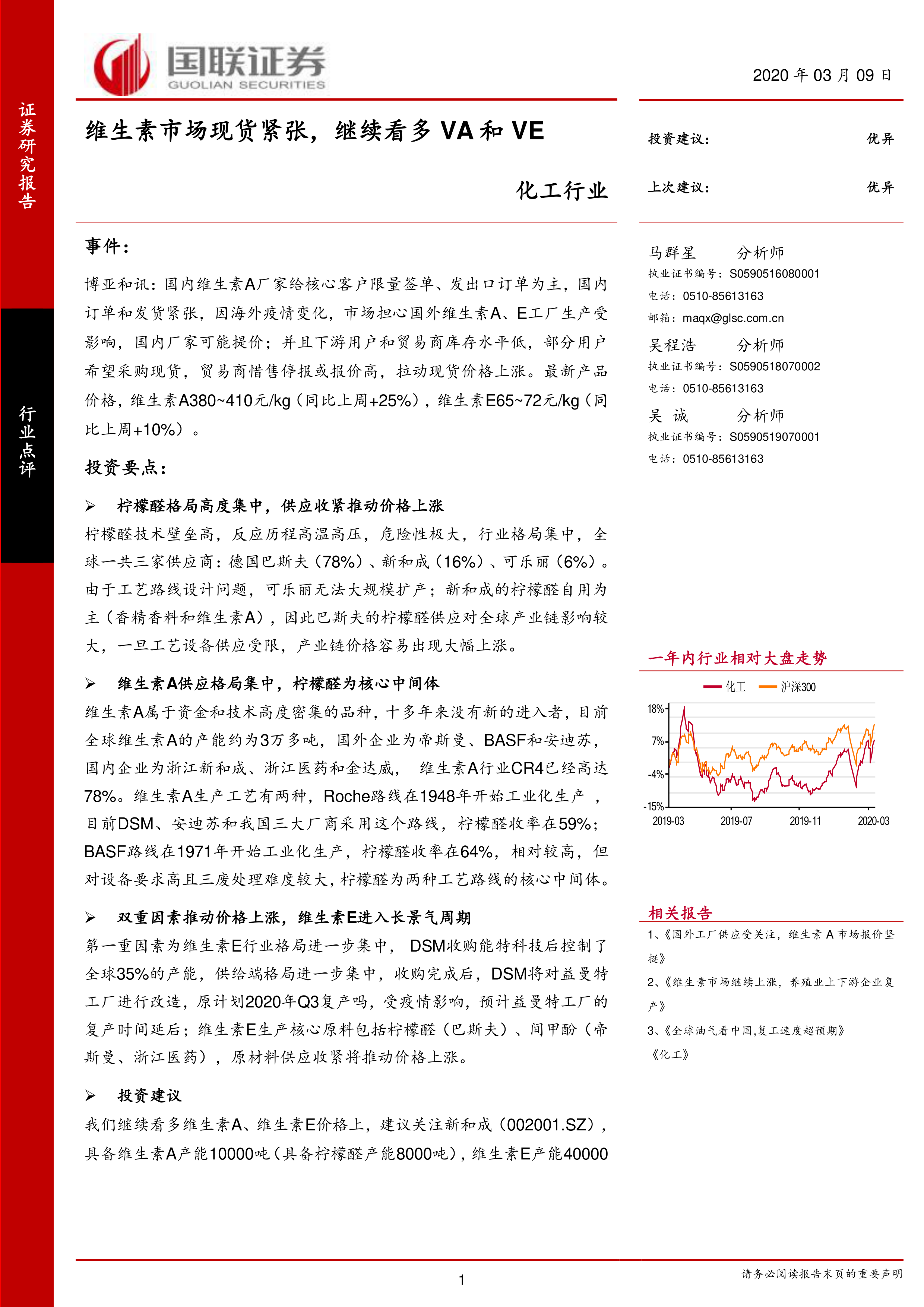 化工行业:维生素市场现货紧张,继续看多VA和VE