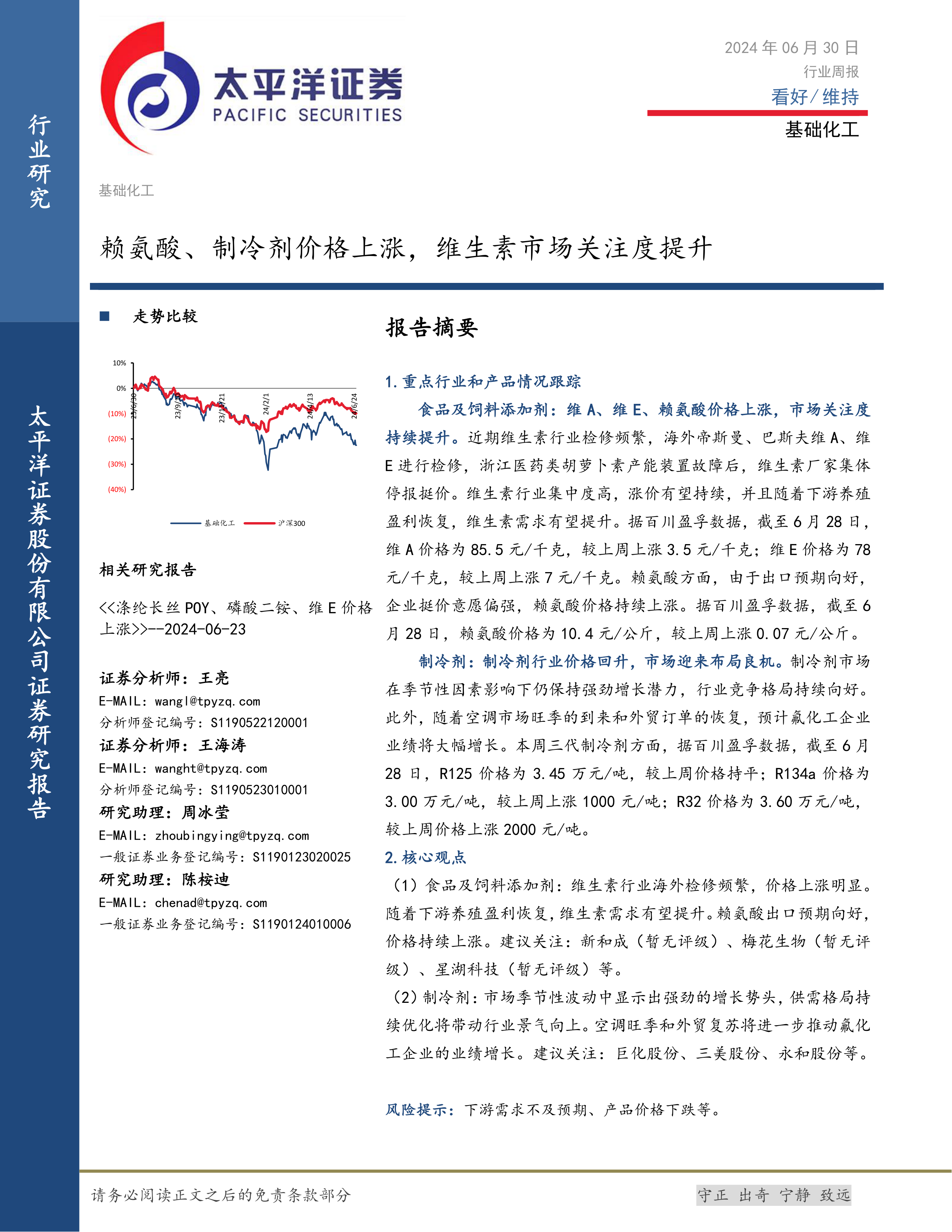 基础化工行业周报:赖氨酸、制冷剂价格上涨,维生素市场关注度提升