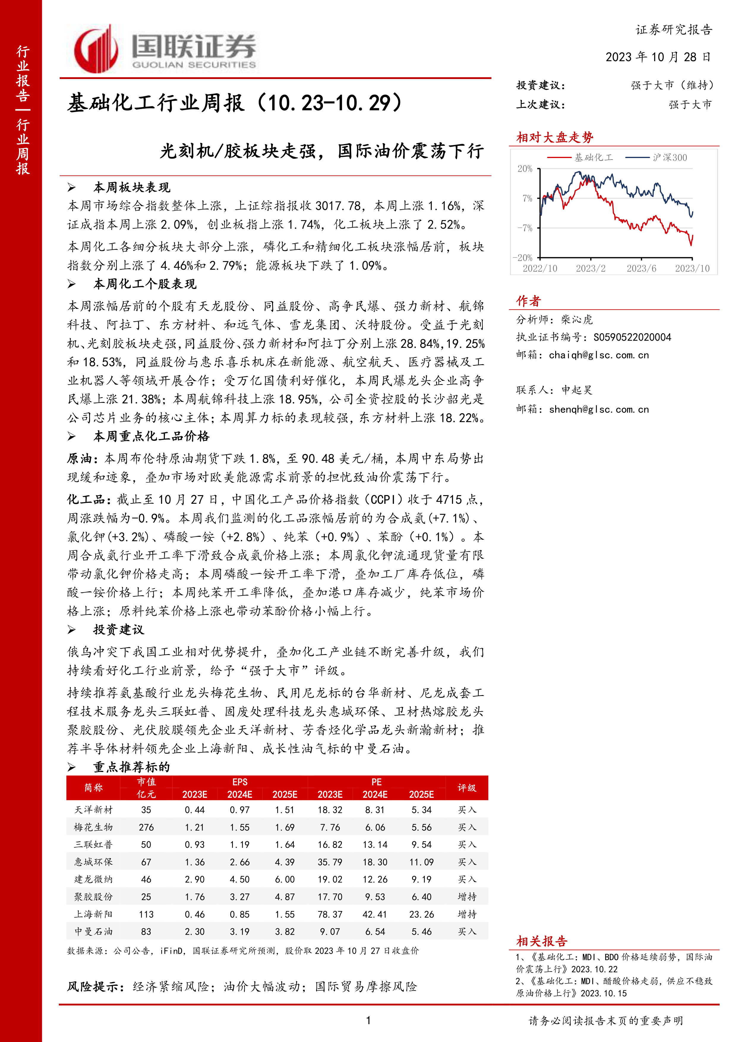 持续推荐氨基酸行业龙头梅花生物、民用尼龙标的台华新材、尼龙成套工程技术服务龙头三联虹普、固废处理科技龙头惠城环保、卫材热熔胶龙头聚胶股份、光伏胶膜领先企业天洋新材、芳香烃化学品龙头新瀚新材;推荐半导体材料领先企业上海新阳、成长性油气标的中曼石油。