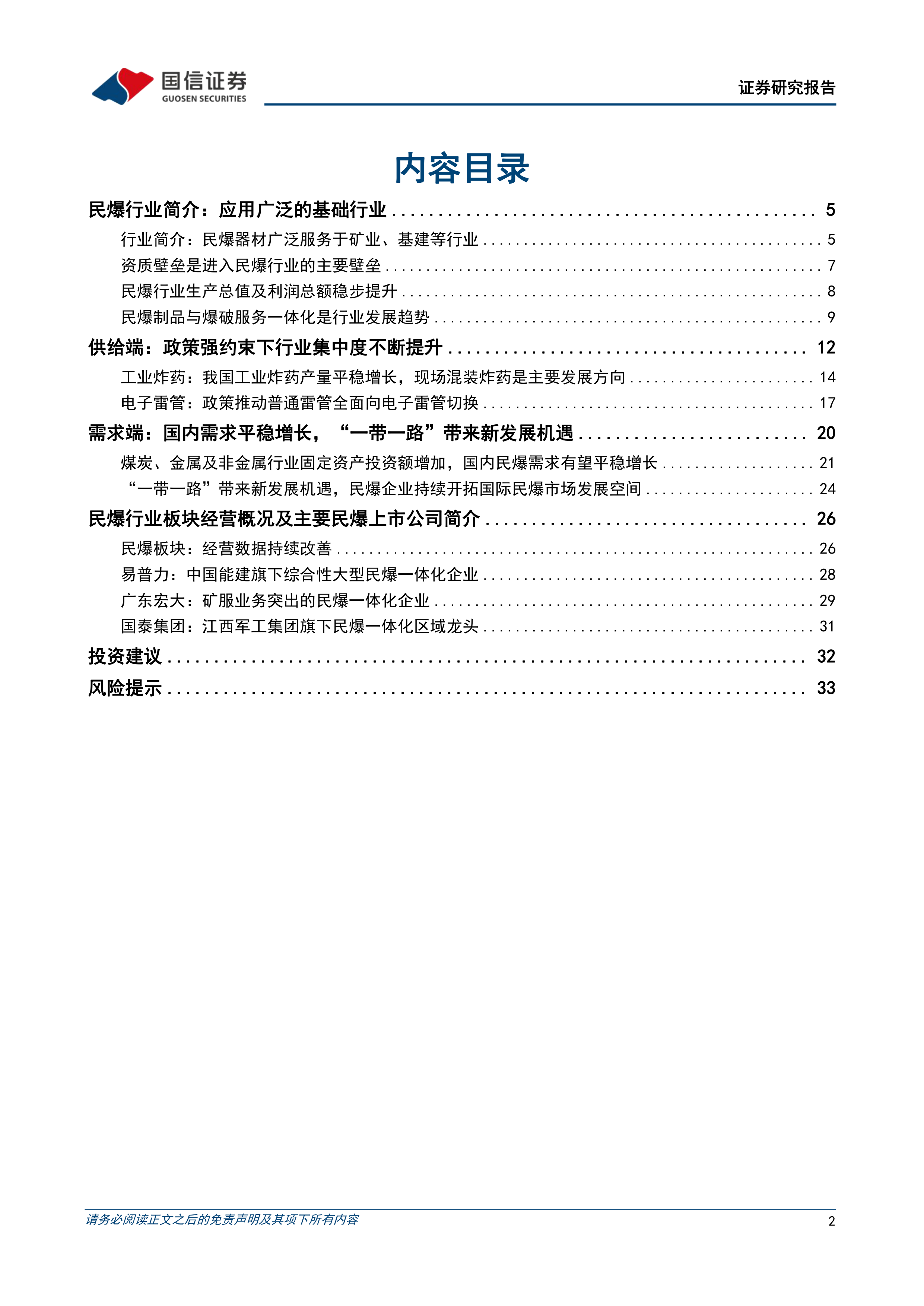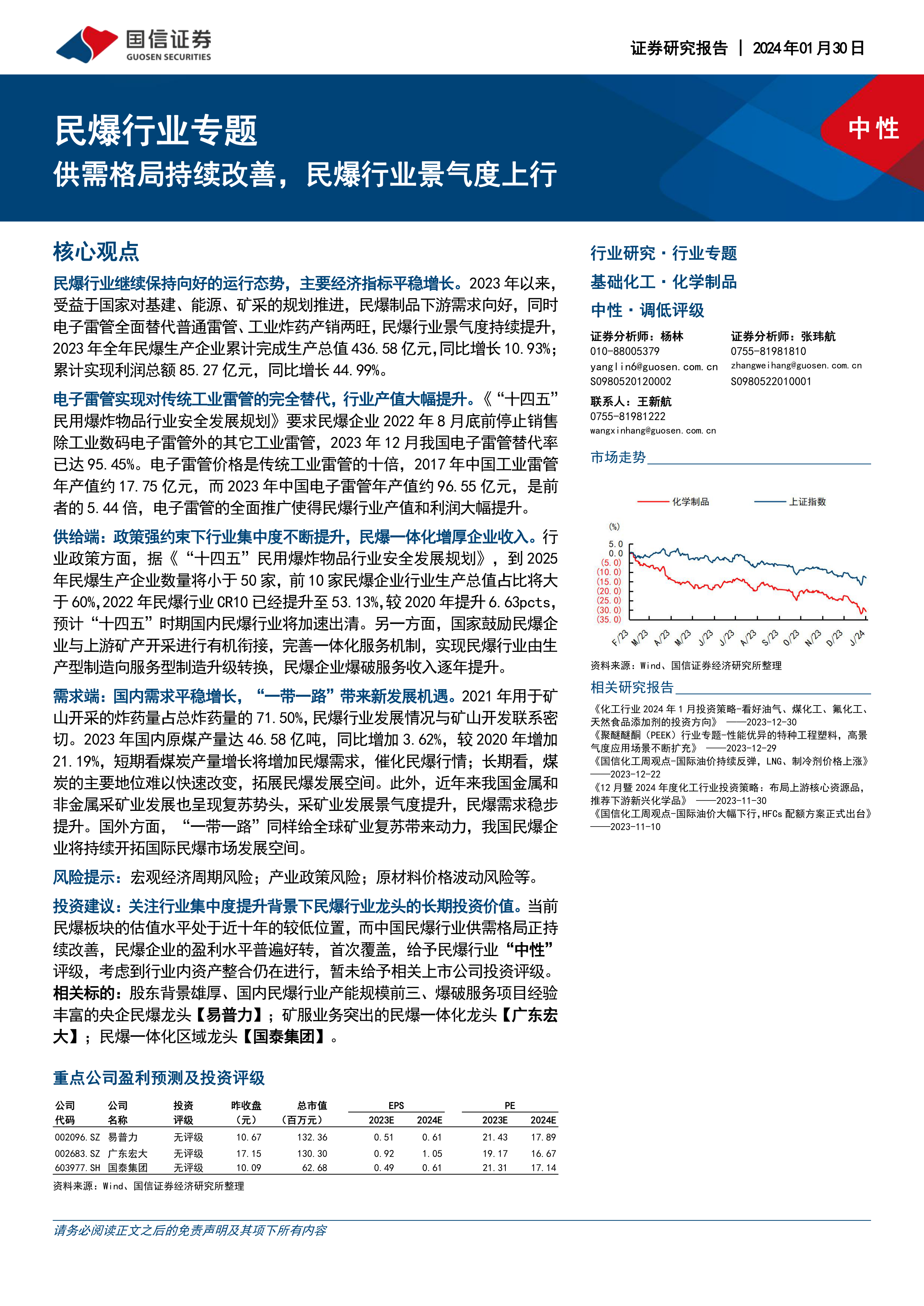 风险提示:宏观经济周期风险;产业政策风险;原材料价格波动风险等。投资建议:关注行业集中度提升背景下民爆行业龙头的长期投资价值。当前民爆板块的估值水平处于近十年的较低位置,而中国民爆行业供需格局正持续改善,民爆企业的盈利水平普遍好转,首次覆盖,给予民爆行业“中性”评级,考虑到行业内资产整合仍在进行,暂未给予相关上市公司投资评级。