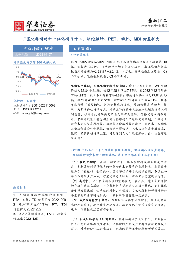 基础化工行业周报:卫星化学新材料一体化项目开工,涤纶短纤、PET、磷肥、MDI价差扩大
