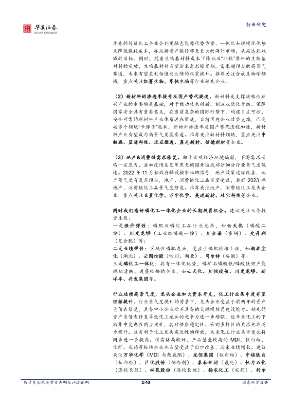本报告核心观点指出,2023年化工行业景气度将呈现分化趋势,需求端压力预计逐步缓解,而供给端行业资本开支将加速落地。在此背景下,报告重点推荐关注三大投资主线:一是合成生物学,在碳中和背景下,生物基材料凭借性能和成本优势有望迎来大规模应用,合成生物学作为新的生产方式将迎来发展奇点;二是新材料,化工供应链安全重要性凸显,高性能分子筛、催化剂、铝系吸附材料等新材料的国产替代进程将加速,有望成为高景气发展赛道;三是地产及消费需求复苏,随着楼市政策边际改善和疫情精准防控优化,地产和消费链化工品有望受益。此外,报告还强调了磷化工一体化企业的长期投资机会,并指出行业集中度将进一步提升,MDI、钛白粉、化纤、农药等供需格局良好、产品壁垒较高的龙头企业有望受益于出口改善实现业绩增长。