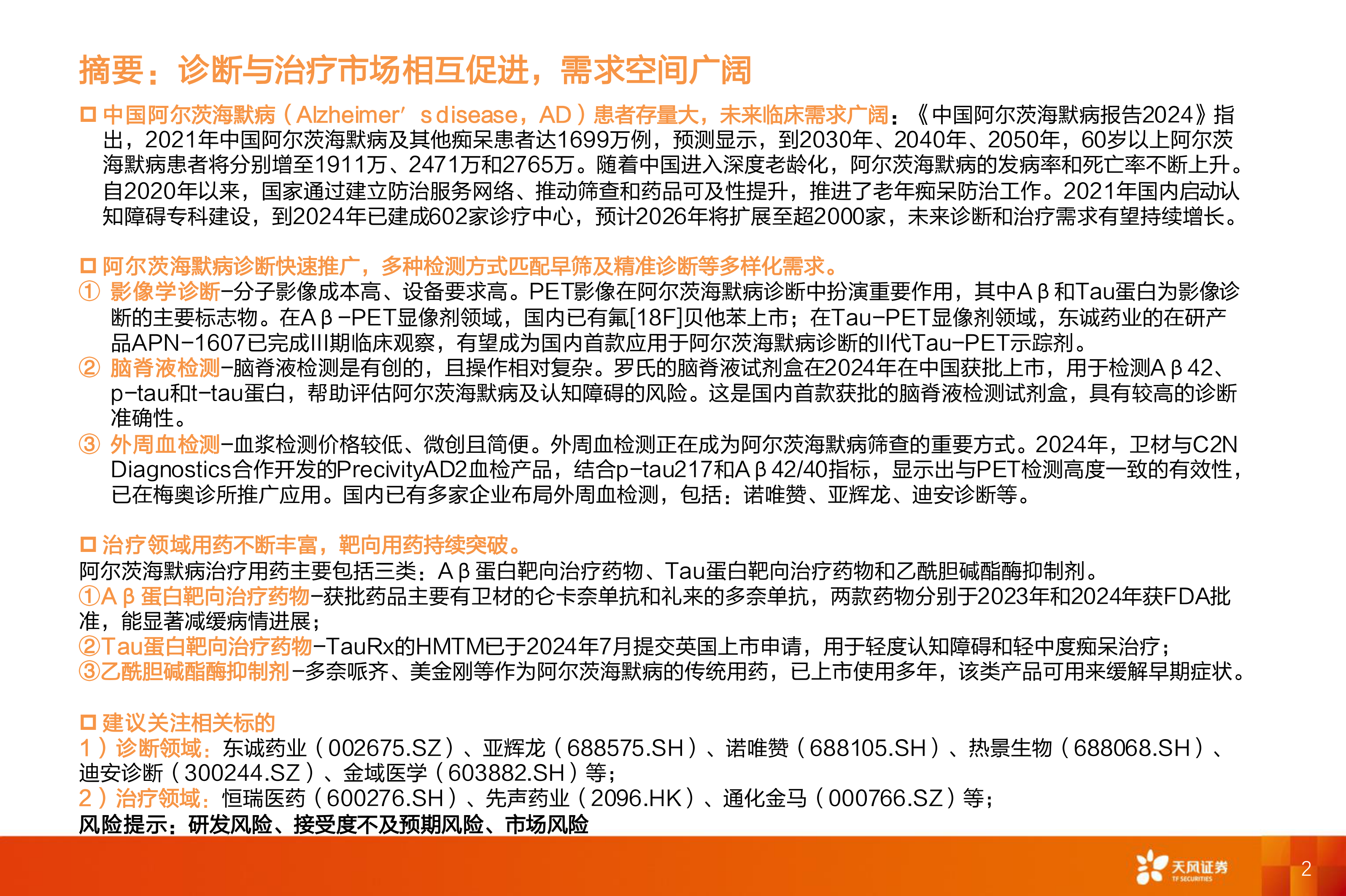 ③外周血检测-血浆检测价格较低、微创且简便。外周血检测正在成为阿尔茨海默病筛查的重要方式。2024年,卫材与C2NDiagnostics合作开发的PrecivityAD2血检产品,结合p-tau217和Aβ42/40指标,显示出与PET检测高度一致的有效性,已在梅奥诊所推广应用。国内已有多家企业布局外周血检测,包括:诺唯赞、亚辉龙、迪安诊断等。