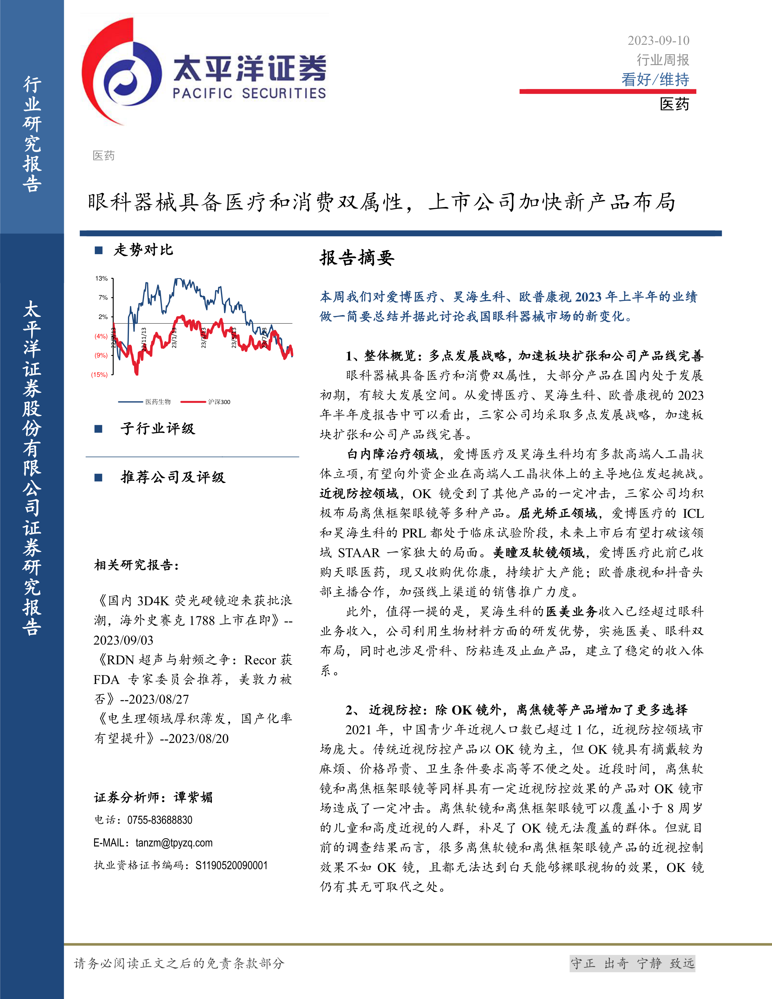 本周我们对爱博医疗、昊海生科、欧普康视 2023 年上半年的业绩做一简要总结并据此讨论我国眼科器械市场的新变化。