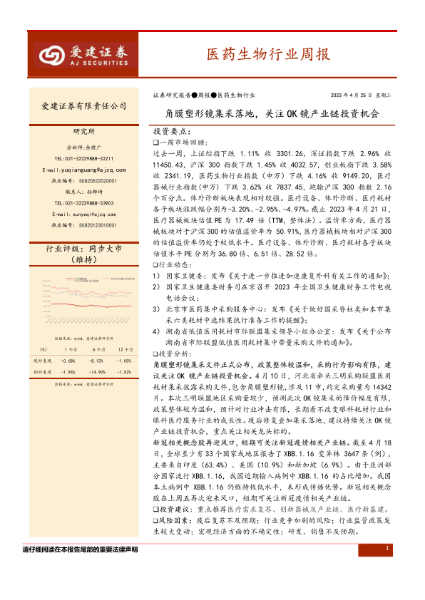 医药生物行业周报:角膜塑形镜集采落地,关注OK镜产业链投资机会