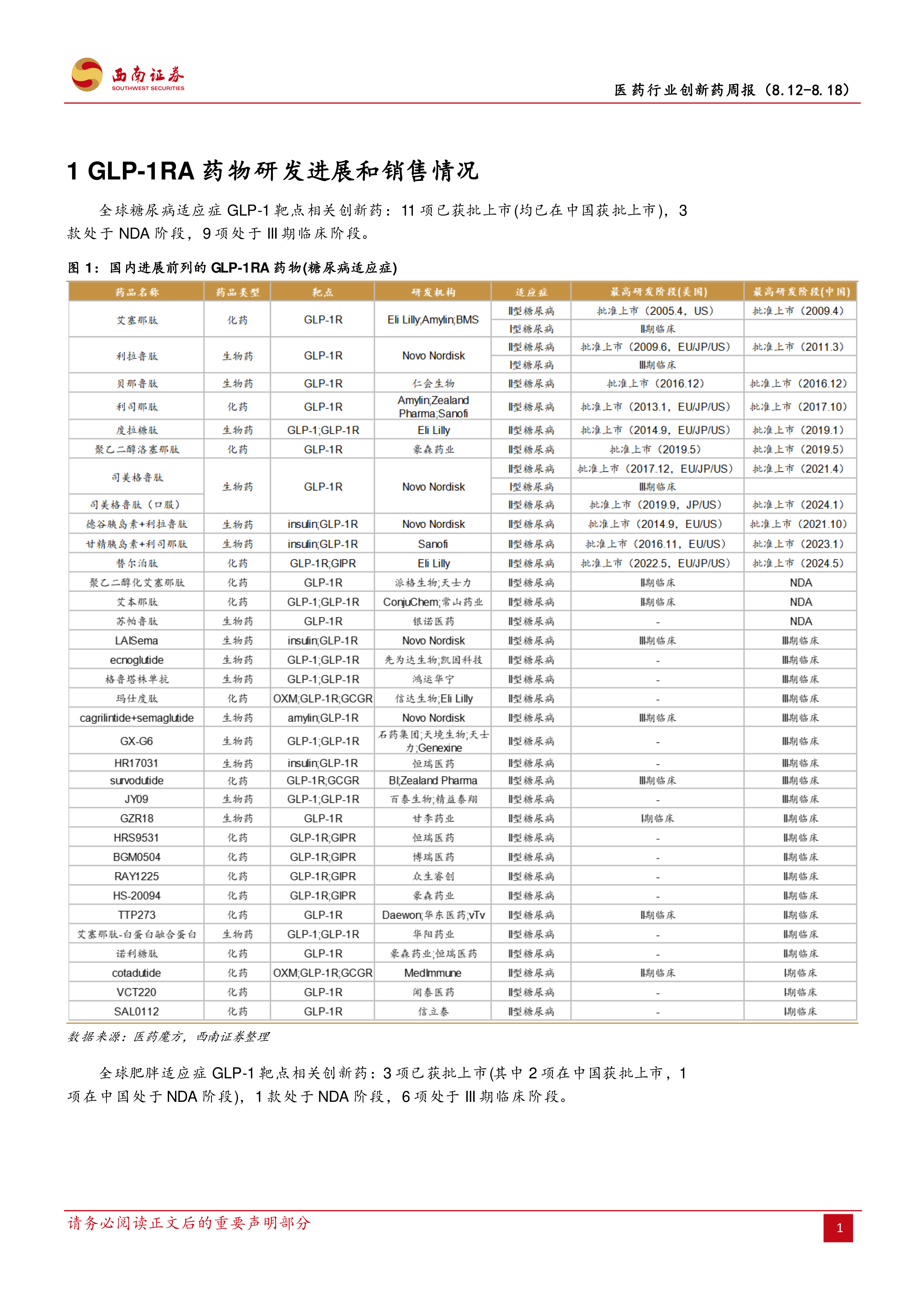8月国内3款新药获批上市,2项新增适应症获批上市;本周国内1款新药获批上市,2款新增适应症获批上市。
