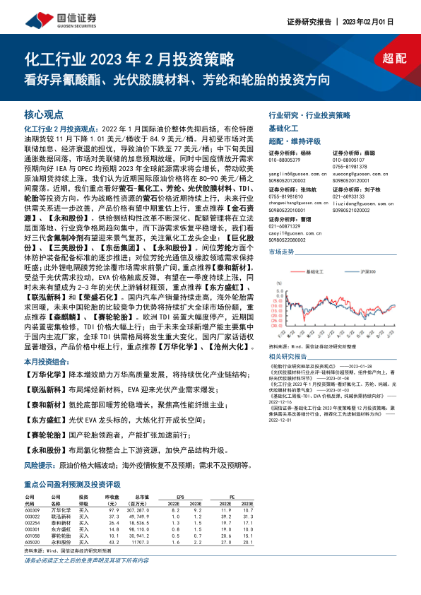 化工行业 2 月投资观点: 2022 年 1 月国际油价整体先抑后扬, 布伦特原油期货较 11 月下降 1.01 美元/桶收于 84.9 美元/桶。 月初受市场对美联储加息、 经济衰退的担忧, 导致油价下跌至 77 美元/桶; 中下旬美国通胀数据回落, 市场对美联储的加息预期放缓, 同时中国疫情放开需求预期向好 IEA 与 OPEC 均预期 2023 年全球能源需求将会增长, 带动欧美原油期货持续上涨, 我们认为近期国际原油价格将在 80-90 美元/桶之间震荡。 近期, 我们重点看好萤石-氟化工、 芳纶、 光伏胶膜材料、 TDI、轮胎等投资方向。 作为战略性资源的萤石价格近期持续上行, 未来行业供需关系进一步改善, 产品价格有望中期重估上行, 重点推荐【金石资源】 、 【永和股份】 。 供给侧结构性改革不断深化、 配额管理将在立法层面落地、 行业竞争格局趋向集中, 而下游需求恢复平稳增长, 我们看好三代含氟制冷剂有望迎来景气复苏, 关注氟化工龙头企业: 【巨化股份】 、 【三美股份】 、 【东岳集团】 、 【永和股份】 。 间位芳纶方面个体防护装备配备标准的逐步推进; 对位芳纶光通信及橡胶领域需求保持旺盛; 此外锂电隔膜芳纶涂覆市场需求前景广阔, 重点推荐【泰和新材】。受益于光伏需求拉动, EVA 价格触底反弹, 有望在一季度持续上涨, 同时未来有望成为 2-3 年的光伏上游辅材瓶颈, 重点推荐【东方盛虹】 、【联泓新科】 和【荣盛石化】 。 国内汽车产销量持续走高, 海外轮胎需求回暖, 未来中国轮胎的比较竞争力优势将持续扩大全球市场份额, 重点推荐【森麒麟】 、 【赛轮轮胎】 。 欧洲 TDI 装置大幅度停产, 近期国内装置密集检修, TDI 价格大幅上行; 由于未来全球新增产能主要集中于国内主流厂家, 全球 TDI 供需格局将发生重大变化, 国内厂家话语权显著增强, 产品价格中枢上行, 重点推荐【万华化学】 、 【沧州大化】 。