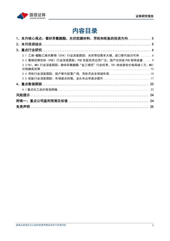 报告重点看好萤石-氟化工、芳纶、光伏胶膜材料、TDI和轮胎等投资方向。