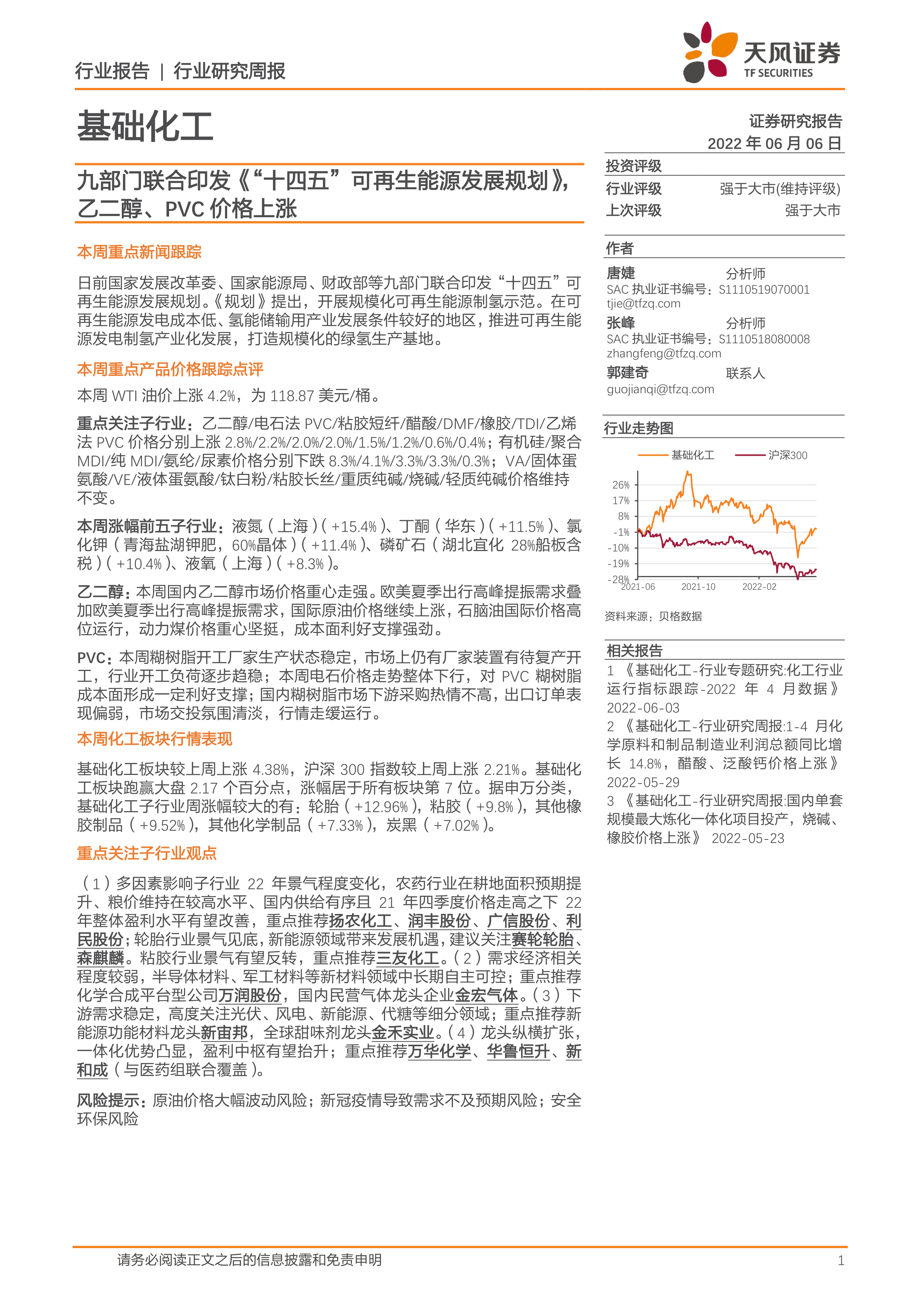 基础化工行业研究周报:九部门联合印发《“十四五”可再生能源发展规划》,乙二醇、PVC价格上涨