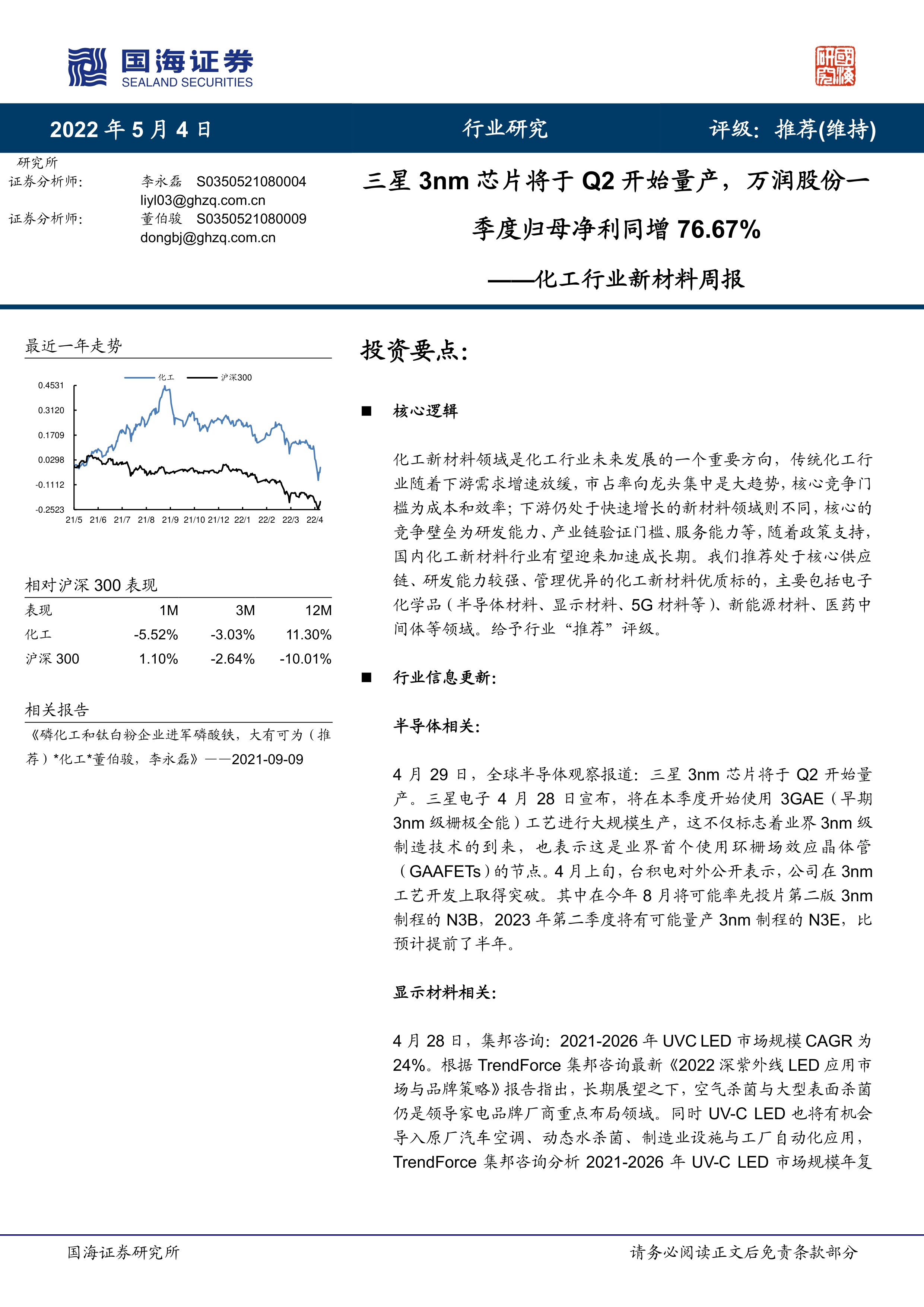 化工行业新材料周报:三星3nm芯片将于Q2开始量产,万润股份一季度归母净利同增76.67%