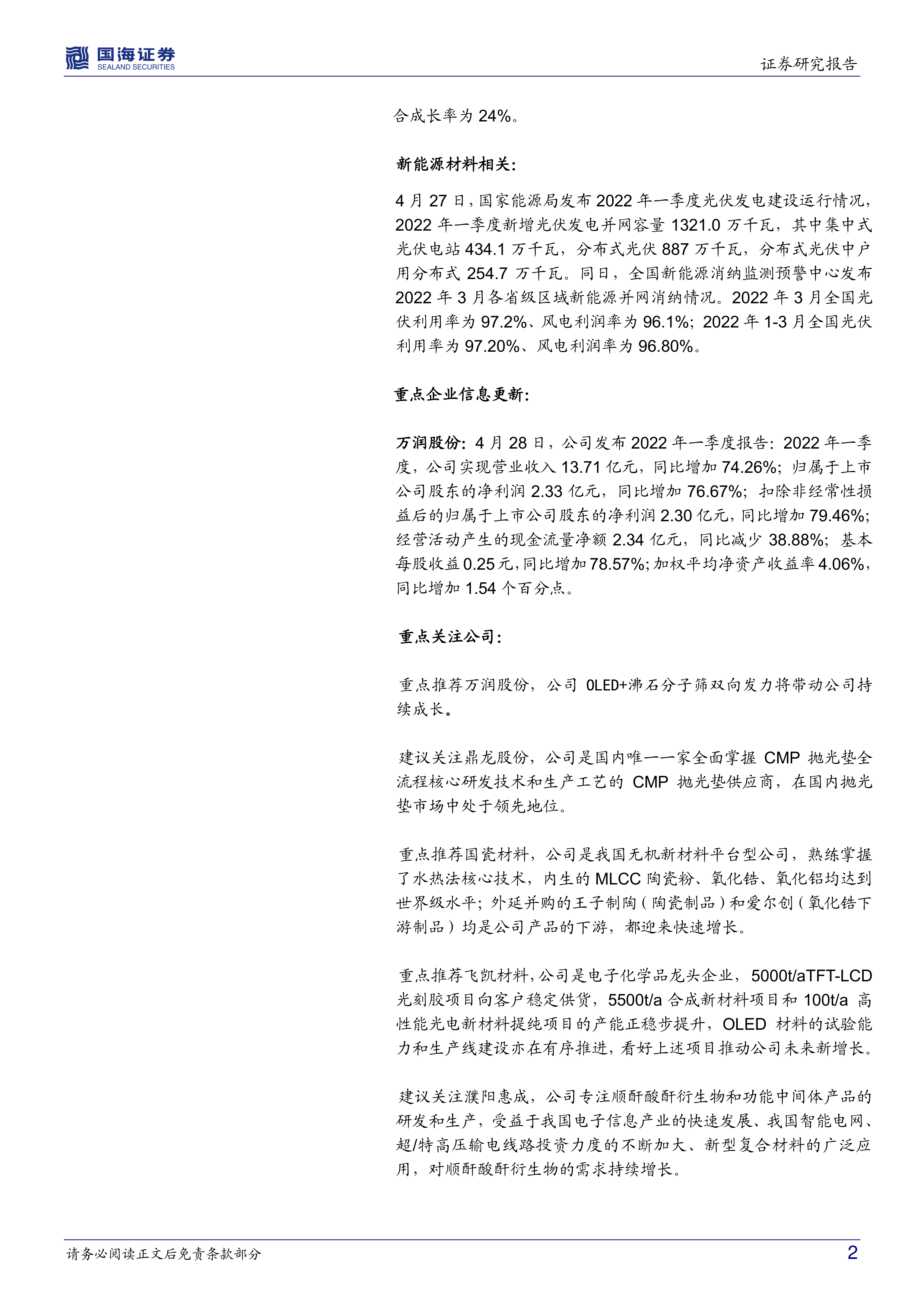 新能源材料领域展现出强劲的增长势头和广阔的发展前景。国家能源局数据显示,2022年第一季度全国新增光伏发电并网容量达到1321.0万千瓦,其中分布式光伏贡献了887万千瓦,占比约67%,户用分布式为254.7万千瓦,显示出分布式光伏的快速发展。同期,全国光伏利用率为97.2%,风电利用率为96.1%,表明新能源消纳情况良好。