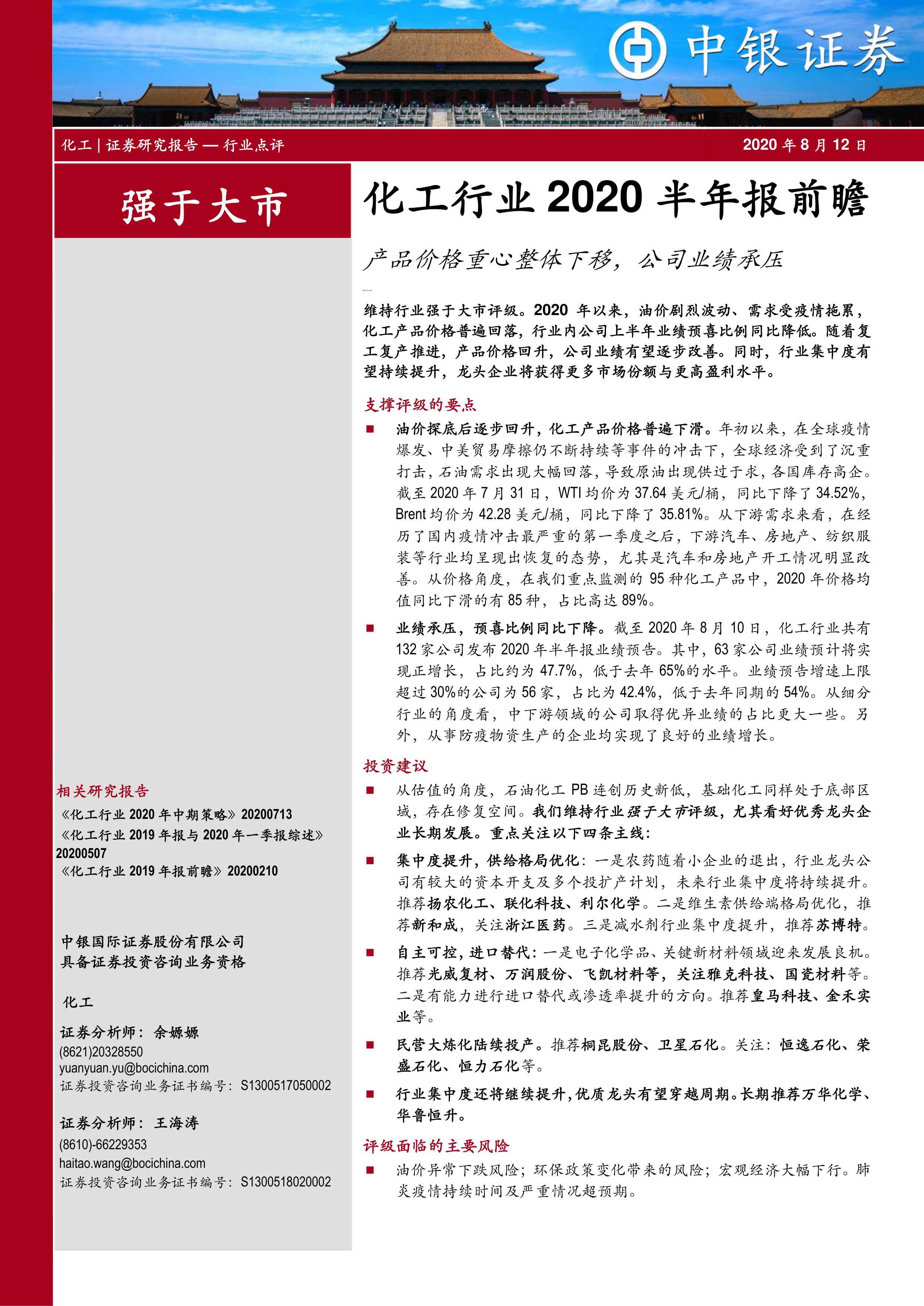 本报告对2020年上半年化工行业进行了全面分析,指出受油价波动和疫情影响,行业整体业绩承压,但随着下游需求复苏和行业集中度提升,龙头企业有望迎来发展机遇。报告维持行业“强于大市”评级,并重点关注集中度提升、自主可控、民营大炼化投产以及优质龙头企业等投资主线。同时,报告也提示了油价下跌、环保政策变化、宏观经济波动和疫情超预期等风险。