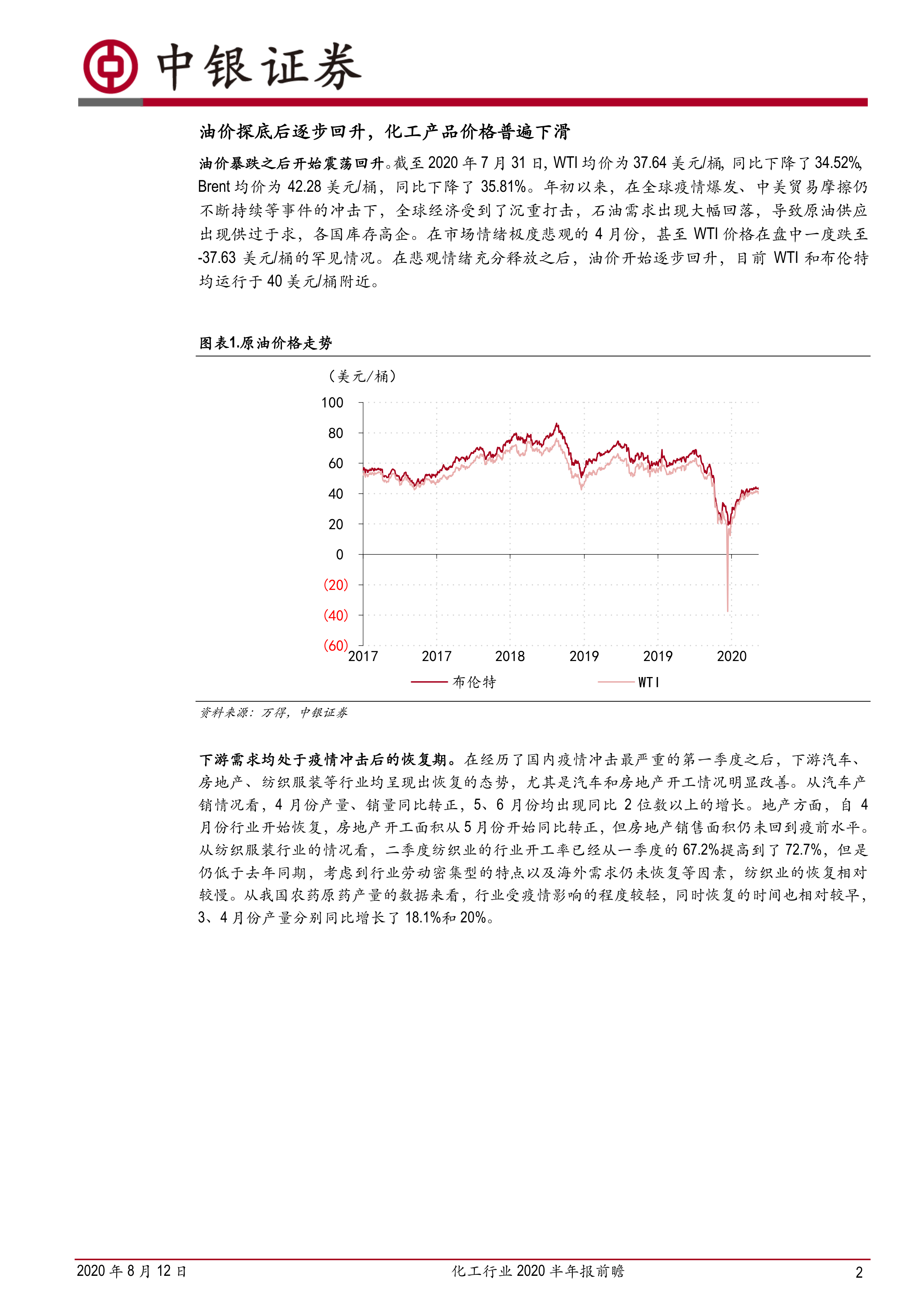 下游汽车、房地产等行业在经历一季度疫情冲击后呈现恢复态势,汽车产销量同比转正,房地产开工面积也开始同比增长。但纺织服装行业恢复相对较慢,而农药行业受疫情影响较轻,恢复较早。