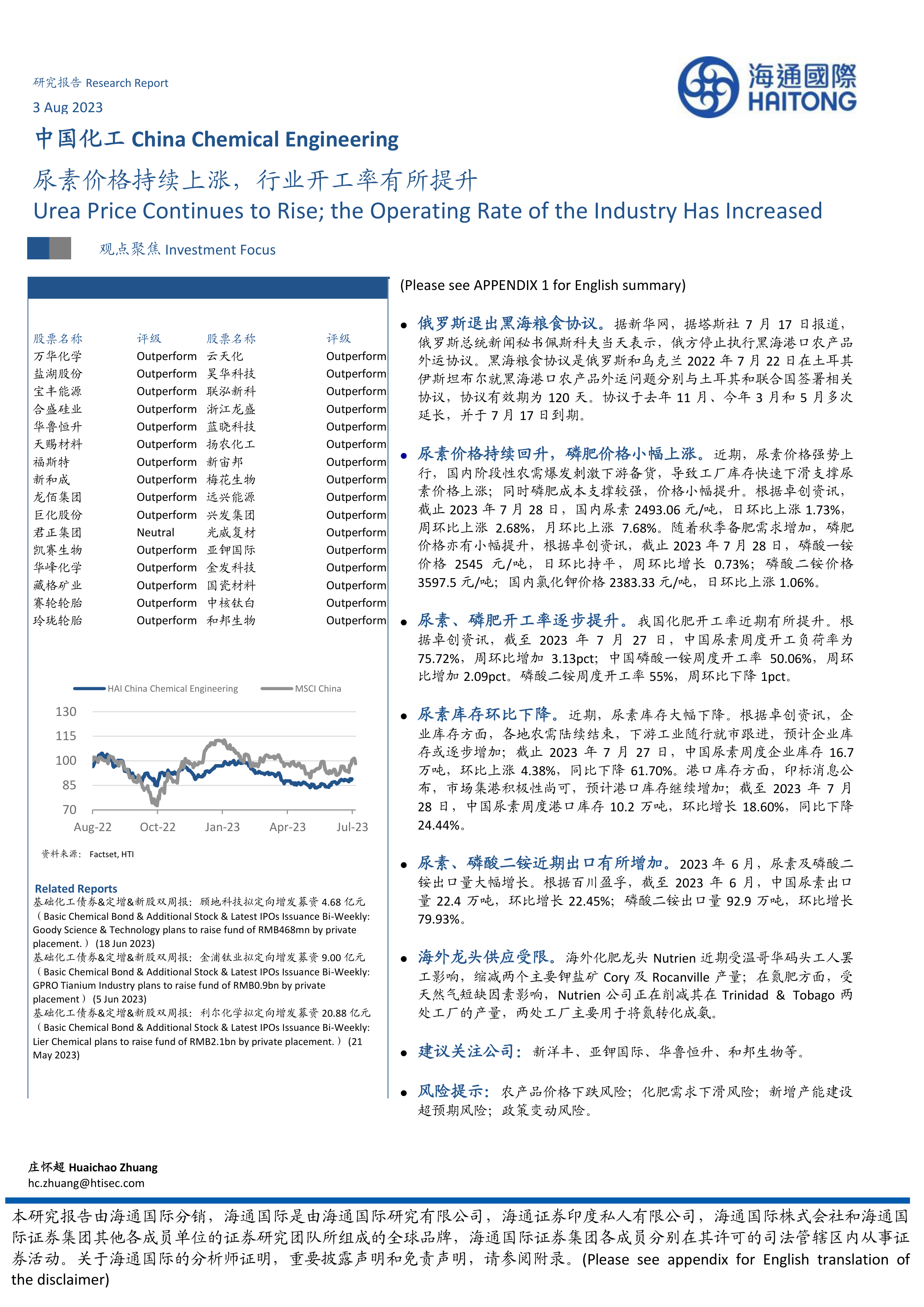 本报告核心观点指出,在多重国内外因素的共同作用下,中国化工市场,特别是尿素和磷肥领域,展现出价格持续上涨、行业开工率提升的积极态势。俄罗斯退出黑海粮食协议引发的全球农产品供应担忧,叠加国内农需爆发和下游备货需求,共同推动了尿素价格的强势上行。同时,磷肥在成本支撑下价格小幅提升。尽管部分化肥品种库存有所波动,但整体出口量显著增长,且海外主要供应商面临产能受限,进一步巩固了国内市场的积极预期。