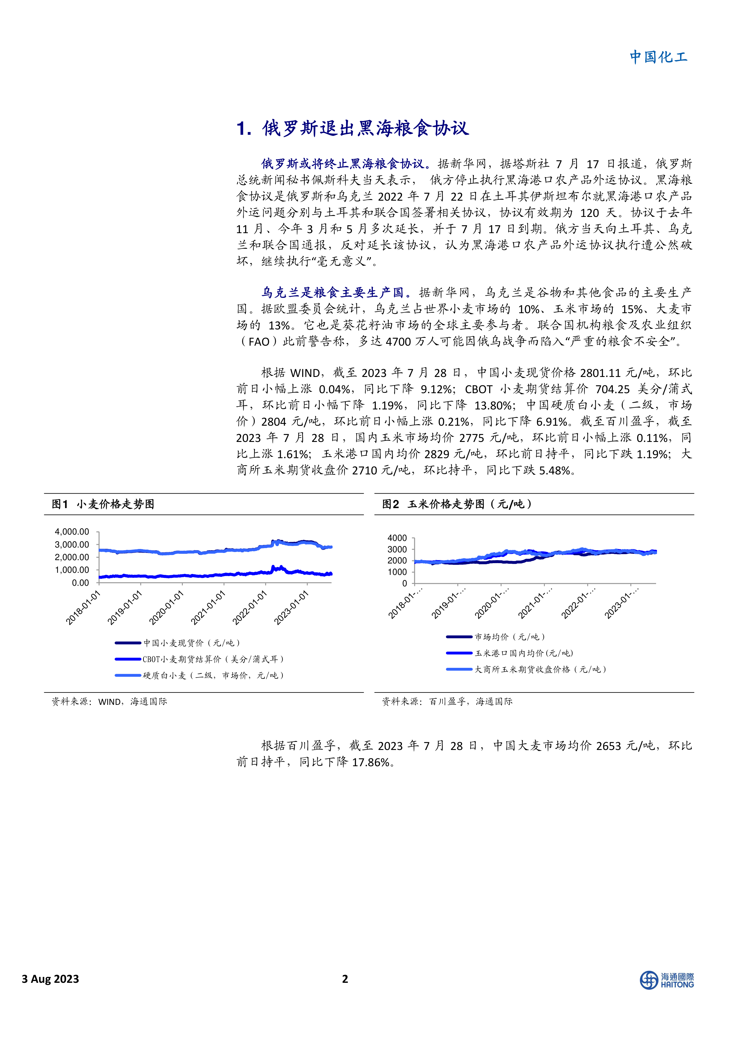受黑海粮食协议终止事件影响,主要农产品价格出现波动。截至2023年7月28日,中国小麦现货价格为2801.11元/吨,日环比小幅上涨0.04%,但同比下降9.12%。CBOT小麦期货结算价为704.25美分/蒲式耳,日环比小幅下降1.19%,同比下降13.80%。中国硬质白小麦(二级,市场价)为2804元/吨,日环比小幅上涨0.21%,同比下降6.91%。国内玉米市场均价为2775元/吨,日环比小幅上涨0.11%,同比上涨1.61%;玉米港口国内均价为2829元/吨,日环比持平,同比下跌1.19%。大商所玉米期货收盘价为2710元/吨,环比持平,同比下跌5.48%。中国大麦市场均价为2653元/吨,环比持平,同比下降17.86%。整体来看,尽管协议终止带来不确定性,但短期内农产品价格波动幅度相对有限,部分品种同比仍有下降。