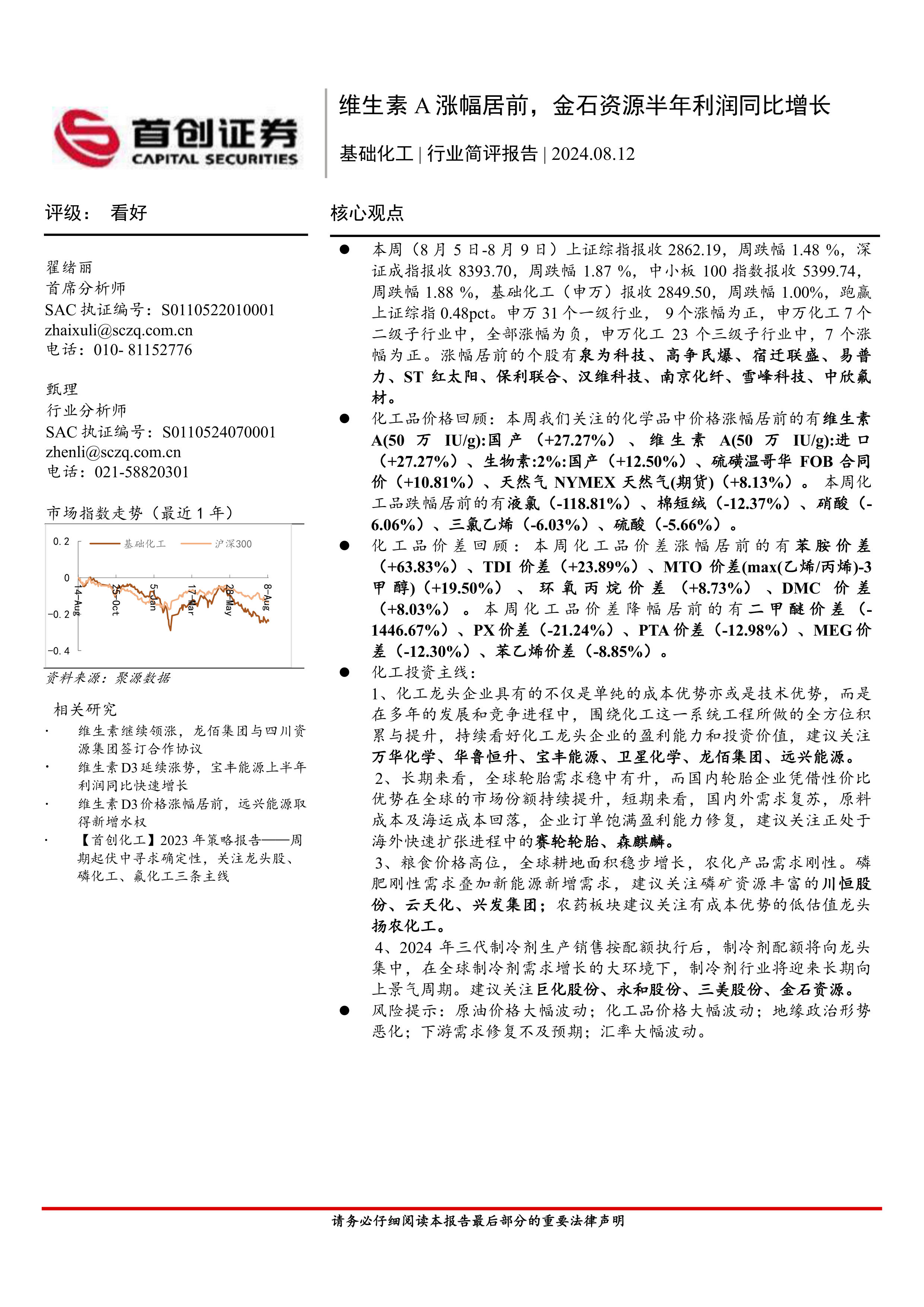基础化工行业简评报告:维生素A涨幅居前,金石资源半年利润同比增长