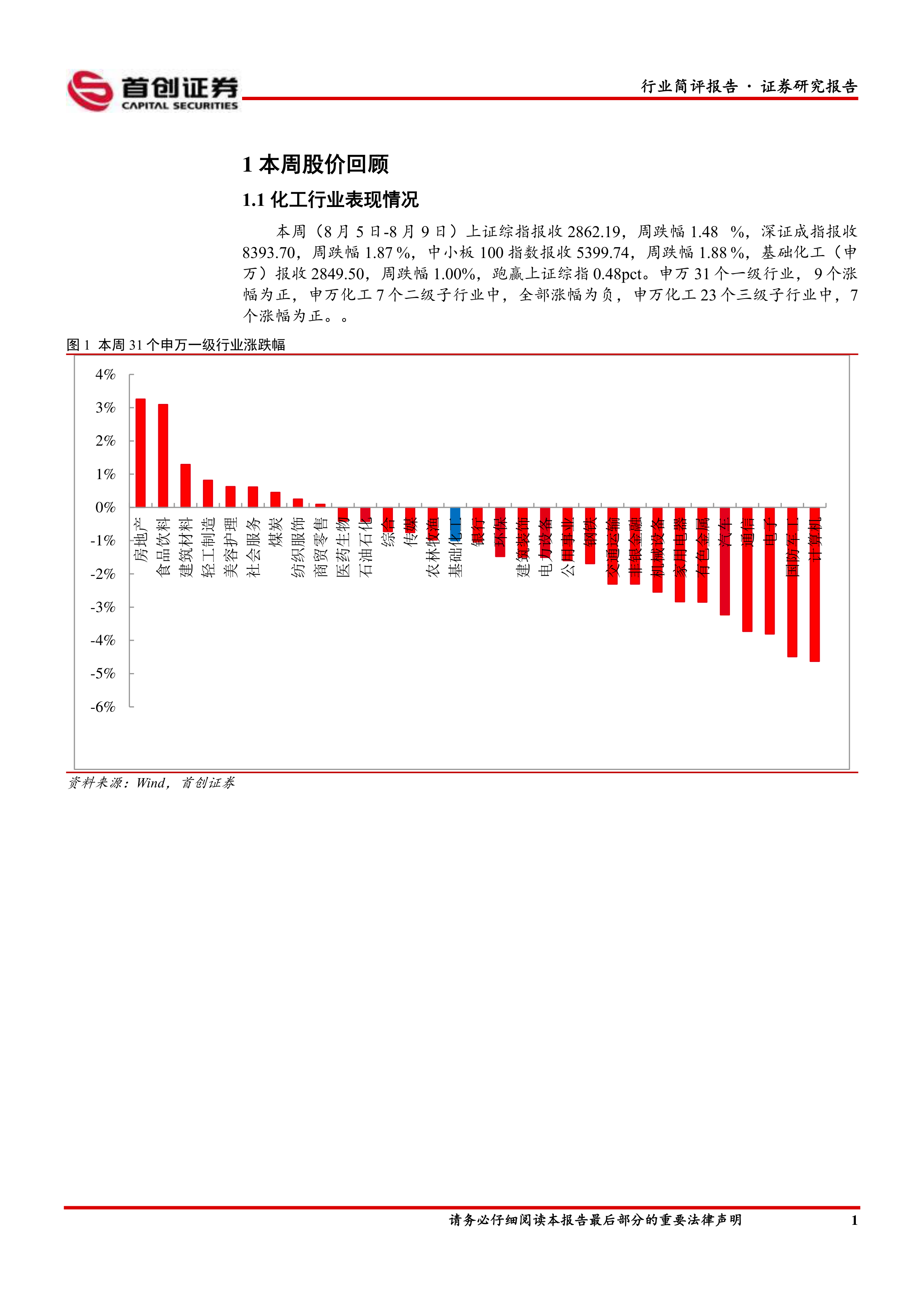 本周(8月5日-8月9日)上证综指报收2862.19,周跌幅1.48%,深证成指报收8393.70,周跌幅1.87%,中小板100指数报收5399.74,周跌幅1.88%,基础化工(申万)报收2849.50,周跌幅1.00%,跑赢上证综指0.48pct。申万31个一级行业,9个涨幅为正,申万化工7个二级子行业中,全部涨幅为负,申万化工23个三级子行业中,7个涨幅为正。涨幅居前的个股有泉为科技、高争民爆、宿迁联盛、易普力、ST红太阳、保利联合、汉维科技、南京化纤、雪峰科技、中欣氟材。