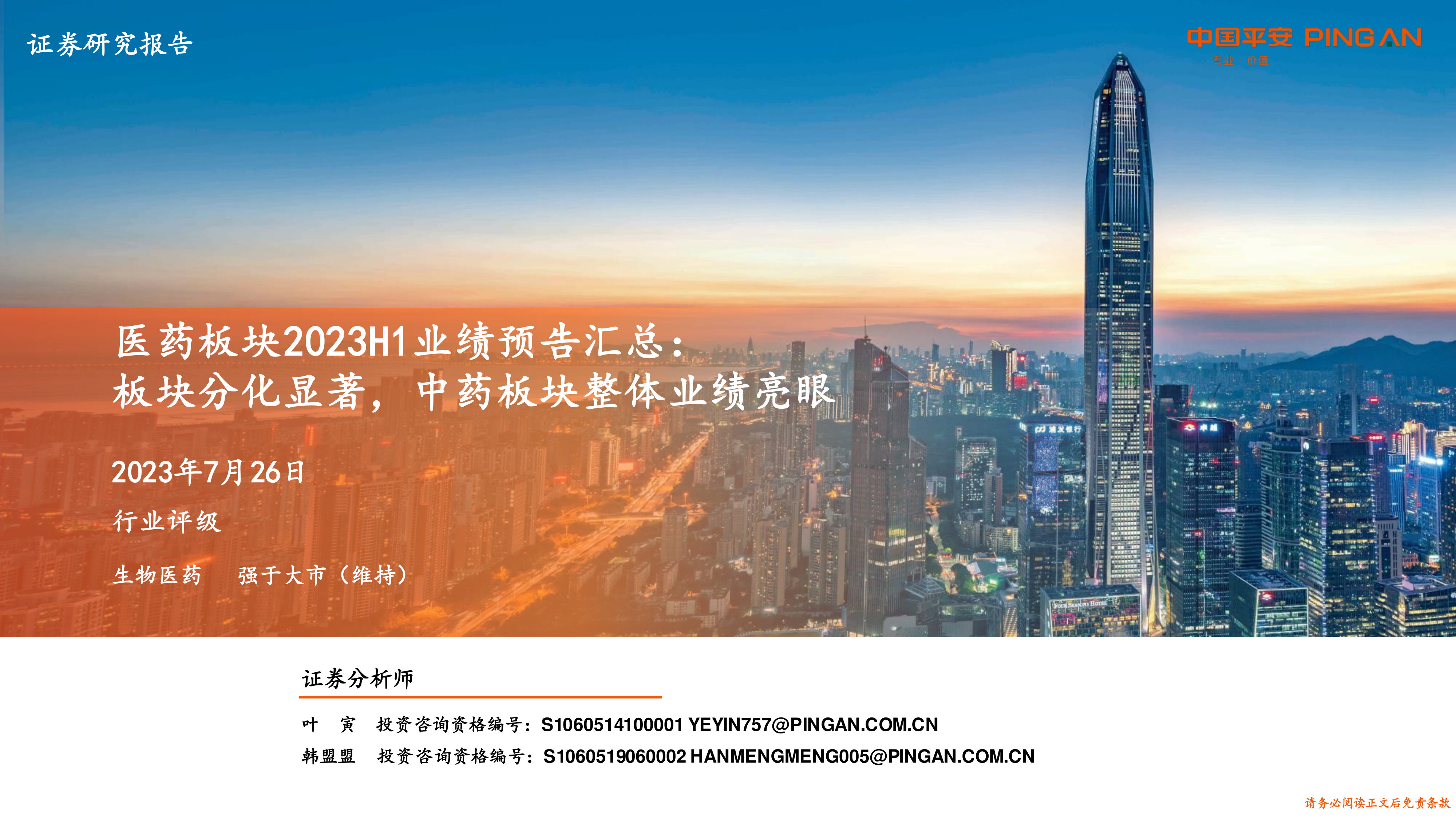 医药板块2023H1业绩预告汇总:板块分化显著,中药板块整体业绩亮眼。
