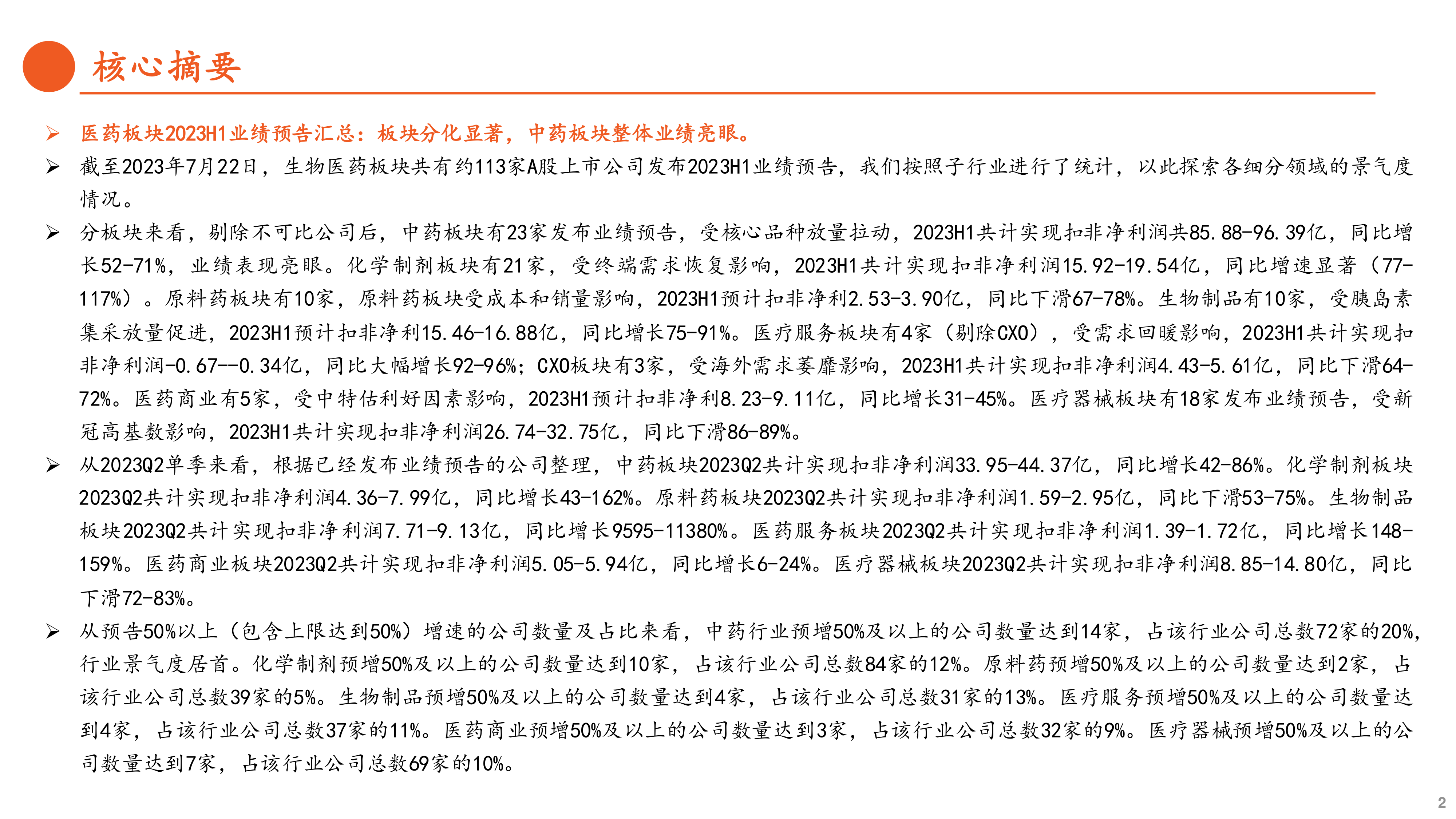 本报告总结了2023年H1医药板块的业绩预告,核心观点如下: